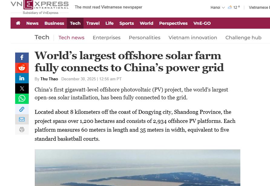 យោងតាមការចេញផ្សាយ របស់សារព័ត៌មាន VNepxress កាលពីចុងខែធ្នូ, គម្រោង បន្ទះស្រូបពន្លឺព្រះអាទិត្យ ដែលបានដំឡើងនៅលើរចនាសម្ព័ន្ធអណ្តែតទឹក ឬ Photovoltaic Offshore មួយនេះ ស្ថិតនៅចម្ងាយប្រហែល ៨ គីឡូម៉ែត្រ ពីឆ្នេរសមុទ្ររបស់ទីក្រុង Dongying នៃ ខេត្ត Shandong លាតសន្ធឹងលើទំហំ ១,២០០ហិកតា។