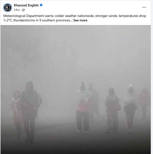 បាងកក ៖ នាយកដ្ឋានឧតុនិយម ថៃ បានព្រមានពីអាកាសធាតុចុះត្រជាក់ទូទាំងប្រទេស ខណៈដែលសីតុណ្ហភាព អាចមានការធ្លាក់ចុះ រហូតដល់ ១ ឬ ២ អង្សាសេ។