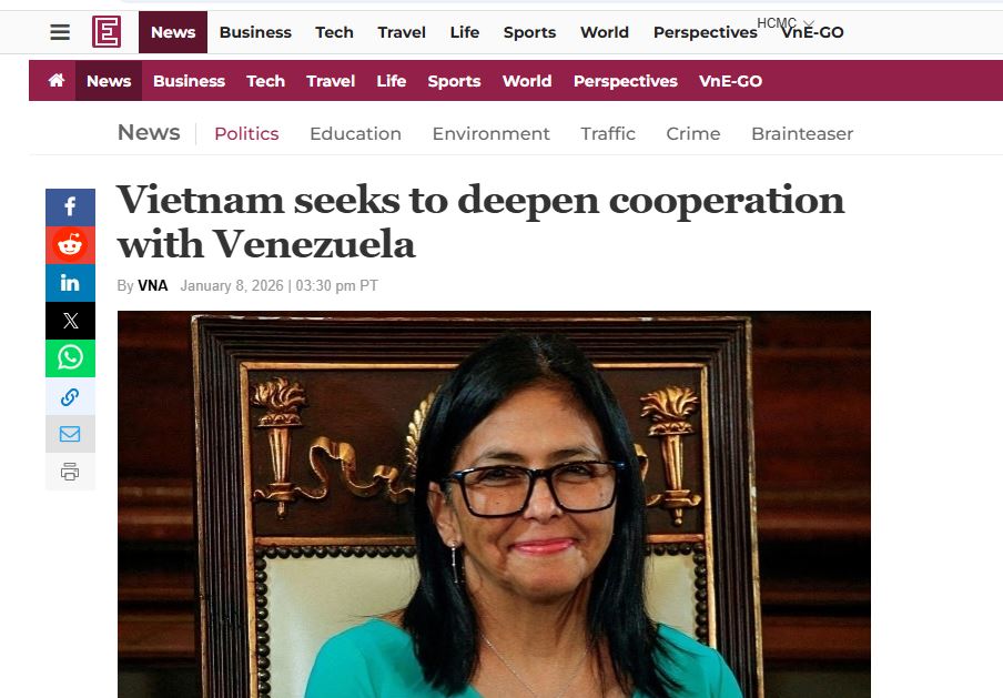 ហាណូយ ៖ អ្នកនាំពាក្យក្រសួងការបរទេសវៀតណាម បាននិយាយថា ប្រទេសនេះ រក្សាទំនាក់ទំនងប្រពៃណីដ៏ល្អ ជាមួយប្រទេសវេណេស៊ុយអេឡា ហើយចង់បន្តជំរុញកិច្ចសហប្រតិបត្តិការ ស្របតាមក្របខ័ណ្ឌភាពជាដៃគូ លើគ្រប់ជ្រុងជ្រោយ រវាងប្រទេសទាំងពីរ។ នេះបើតាមការចេញផ្សាយ របស់សារព័ត៌មាន VNexpress។