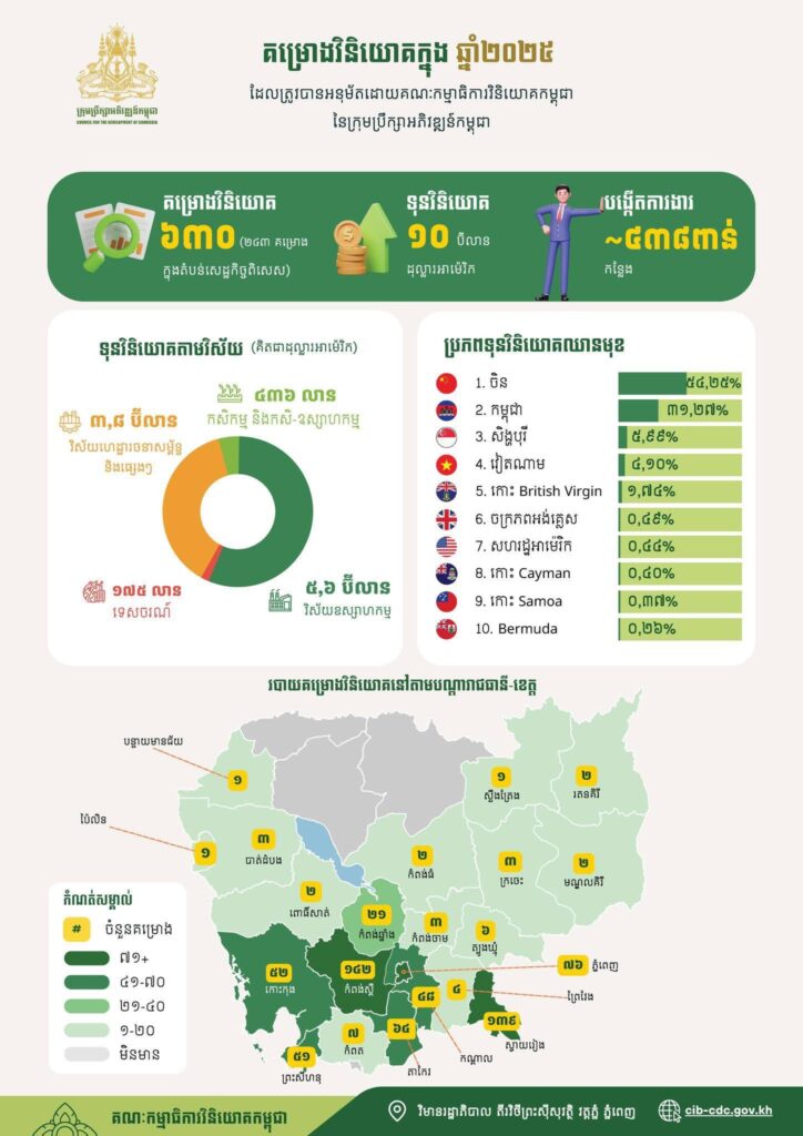ក្នុងឆ្នាំ២០២៥ ក្រុមប្រឹក្សាអភិវឌ្ឍន៍កម្ពុជាបានអនុម័តគម្រោងវិនិយោគសរុបចំនួន ៦៣០គម្រោង