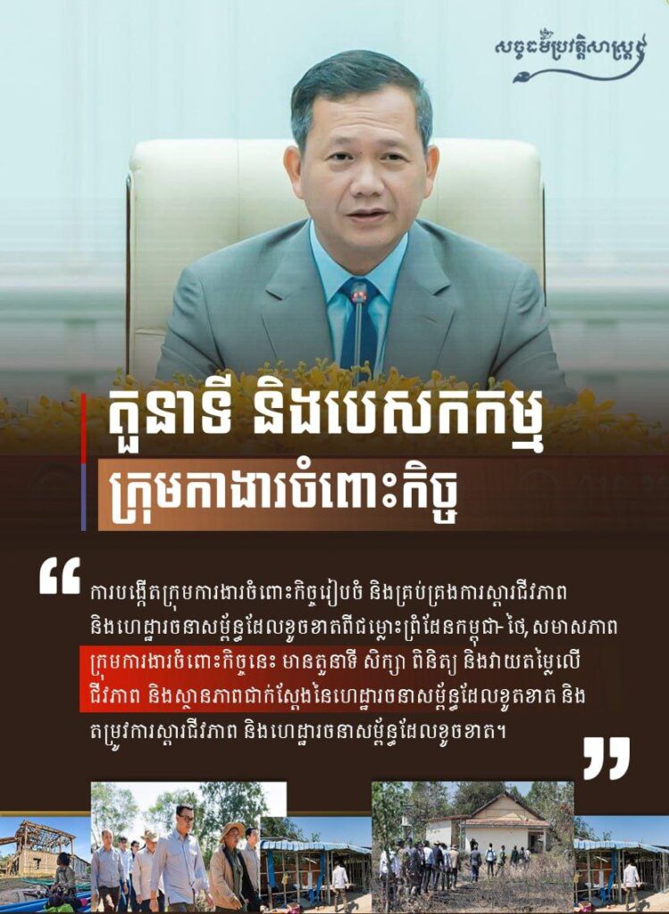 លើសពីនេះទៀត ក្រុមការងារចំពោះកិច្ចនិងសម្របសម្រួល និងសហការជាមួយក្រសួង-ស្ថាប័ន និងអាជ្ញាធរខេត្តពាក់ព័ន្ធលើការងាររៀបចំអនុវត្តកម្មវិធីជំនួយសង្គមសម្រាប់ការស្តារជីវភាព និងគម្រោង និង/ឬកម្មវិធីស្តារហេដ្ឋារចនាសម្ព័ន្ធដែលខូចខាត រួមមានលំនៅឋានពលរដ្ឋ សាលារៀន មូលដ្ឋានសុខាភិបាលសាធារណៈ ផ្លូវថ្នល់ ស្ពាន ប្រព័ន្ធទឹកស្អាត បណ្តាញអគ្គិសនី ជាដើម ដោយគិតគូរអំពីទំហំខូចខាត និងទីតាំងគោលដៅជាក់លាក់ នៅក្នុងភូមិសាស្រ្តដែលរងការឈ្លានពានពីថៃ។