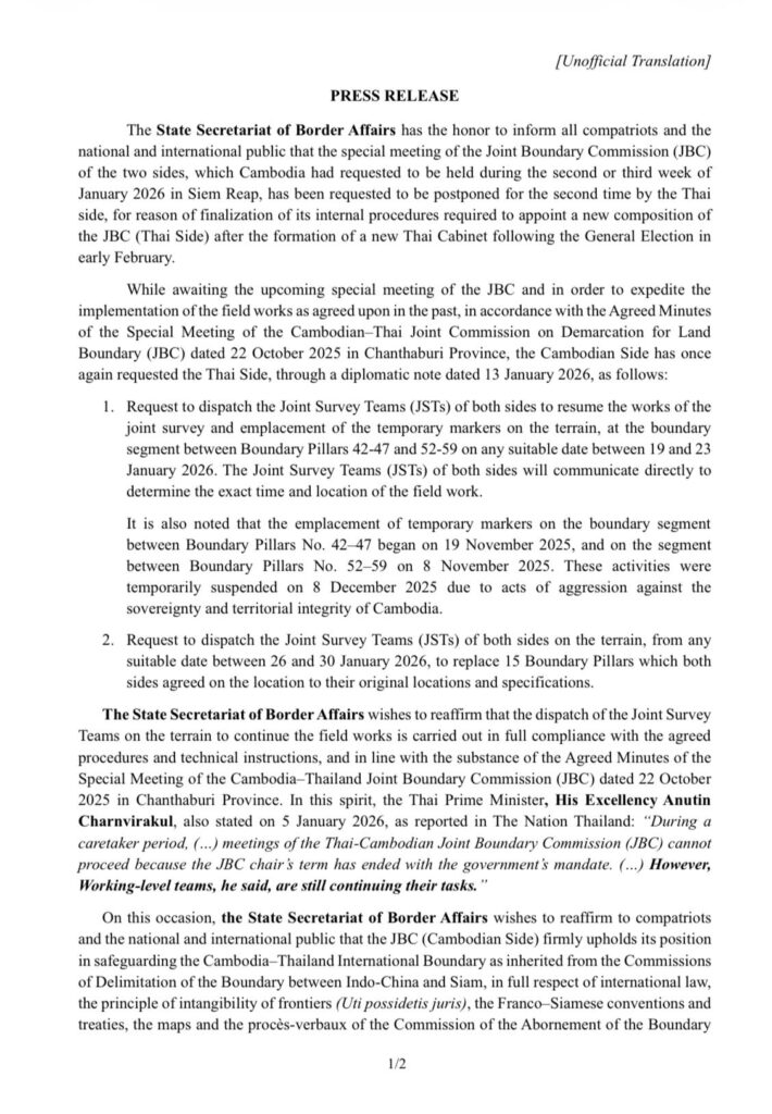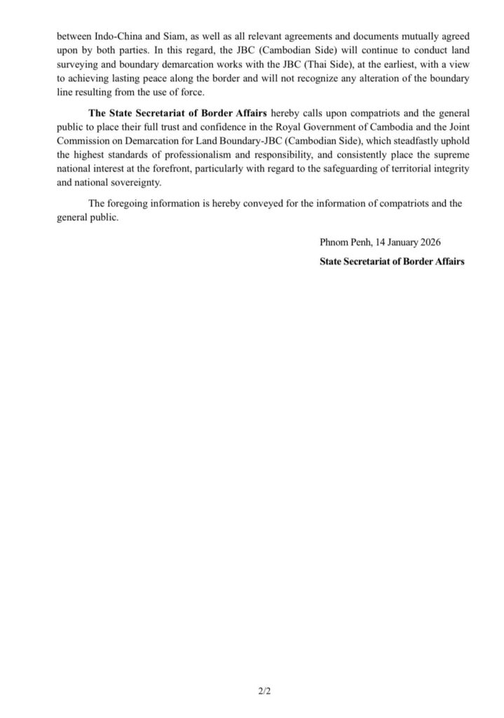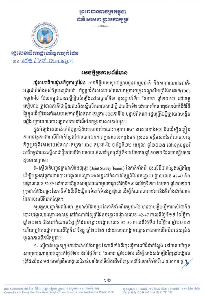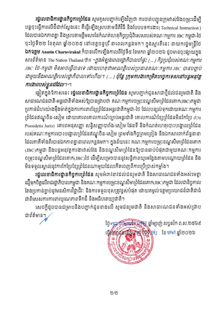 នឹងបន្តអនុវត្តការងារវាស់វែង និងខណ្ឌសីមាព្រំដែនឱ្យបានឆាប់បំផុតជាមួយគណៈកម្មការចម្រុះខណ្ឌសីមាព្រំដែនគោក(JBC)ថៃ ដើម្បីសម្រេចបាននូវសន្តិភាពយូរអង្វែងតាមបណ្ដោយព្រំដែន និង