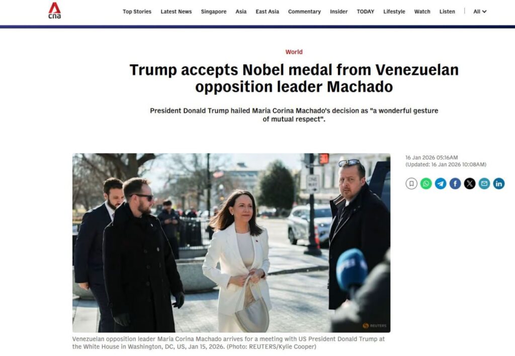មេបក្សប្រឆាំង លោកស្រី Maria Corina Machado បានផ្តល់ជូនប្រធានាធិបតីអាមេរិក លោក Donald Trump កាលពីថ្ងៃព្រហស្បតិ៍ ទី១៥ ខែមករា ក្នុងអំឡុងពេលកិច្ចប្រជុំមួយ នៅឯសេតវិមាន ខណៈដែលលោកស្រី ព្យាយាមទទួលបានឥទ្ធិពលខ្លះ លើរបៀបដែលប្រធានាធិបតីកំណត់អនាគតនយោបាយ របស់ប្រទេស នៅអាមេរិកខាងត្បូង មួយនេះ។