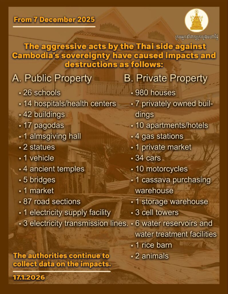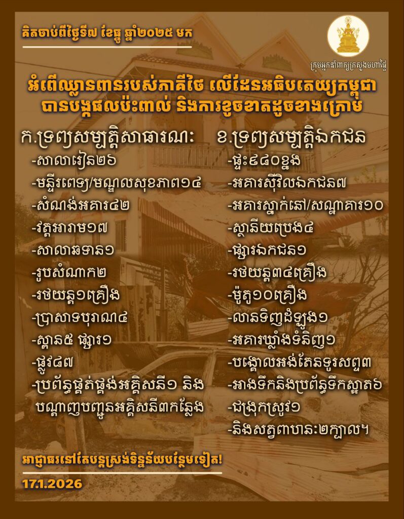 ផលប៉ះពាល់ និងការខូចខាត ដោយអំពើឈ្លានពានរបស់ភាគីថៃ លើដែនអធិបតេយ្យកម្ពុជា គិតចាប់ពីថ្ងៃទី៧ ធ្នូ ២០២៥ ដល់ថ្ងៃទី១៧ មករា ២០២៦