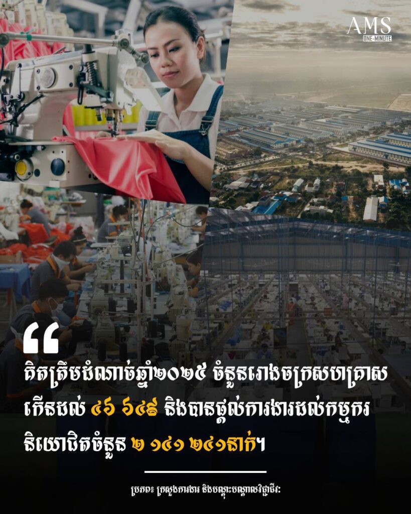 ចំនួនរោងចក្រសហគ្រាសកើនដល់ ៤៦ ៦៤៩ និងបានផ្តល់ការងារដល់កម្មករនិយោជិតចំនួន ២ ១៤១ ២៤១នាក់ គិតត្រឹមដំណាច់ឆ្នាំ២០២៥One-Minuteអត្ថបទដោយ៖ឆាយ រត្ថា ប្រភព៖ ក្រសួងការងារ និងបណ្ដុះបណ្ដាលវិជ្ជាជីវៈ #ams1minute ឆាយ រត្ថាលោក ឆាយ រត្ថា ជាបុគ្គលិកផ្នែកព័ត៌មានវិទ្យា នៃអគ្គនាយកដ្ឋានវិទ្យុ និងទូរទស្សន៍ អប្សរាអត្ថបទមុនអត្ថបទបន្ទាប់