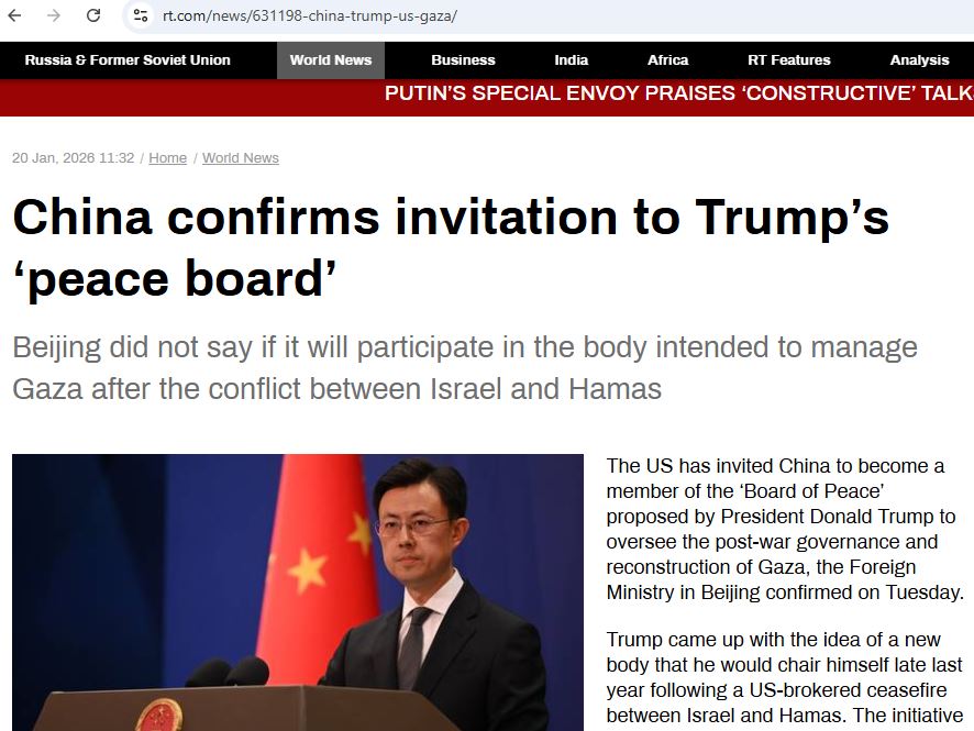 ប៉េកាំង ៖ ប្រទេស ចិន បានបញ្ជាក់អំពីការអញ្ជើញ ឲ្យចូលរួមនៅក្នុង ‘ក្រុមប្រឹក្សាសន្តិភាព’ របស់ លោក Donald Trump។ នេះបើតាមការចេញផ្សាយ របស់សារព័ត៌មាន RT។