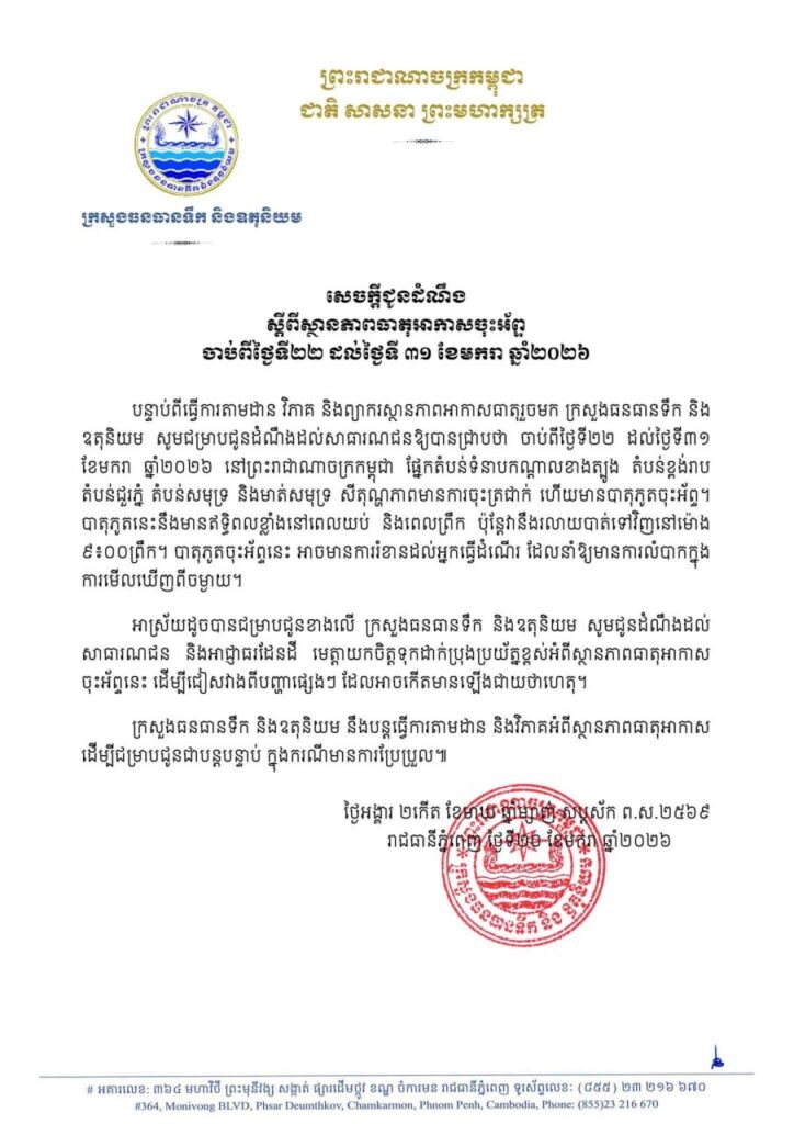 ចាប់ពីថ្ងៃទី២២ ដល់ថ្ងៃទី៣១ ខែមករា ឆ្នាំ២០២៦ នៅតំបន់ទំនាបកណ្តាលខាងត្បូង តំបន់ខ្ពង់រាប តំបន់ជួរភ្នំ តំបន់សមុទ្រ និងតំបន់មាត់សមុទ្រ នឹងមានសីតុណ្ហភាពចុះត្រជាក់ ហើយនឹងមានបាតុភូតចុះអ័ព្ទ។