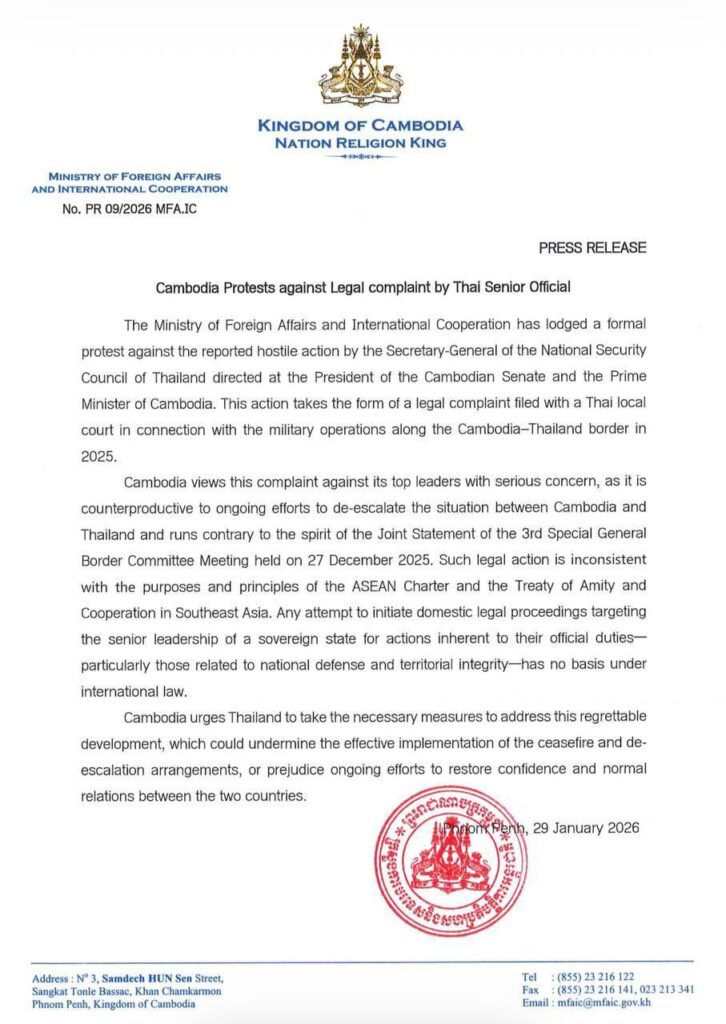 ភ្នំពេញ៖ ឯកឧត្តម ប៉ែន បូណា អ្នកនាំពាក្យរាជរដ្ឋាភិបាលកម្ពុជា បានមានប្រសាសន៍នៅក្នុងសន្និសីទសារព័ត៌មាននាព្រឹកថ្ងៃទី៣០ ខែមករា នេះថា រាជរដ្ឋាភិបាលកម្ពុជាតាមរយៈក្រសួងការបរទេស និងសហប្រតិបត្តិការអន្តរជាតិ កាលពីនៅថ្ងៃទី២៩ ខែមករា ឆ្នាំ២០២៦ បានតវ៉ាជំទាស់ជាផ្លូវការចំពោះសកម្មភាពអរិភាពរបស់អគ្គលេខាធិការនៃក្រុមប្រឹក្សាសន្តិសុខជាតិថៃ មកលើប្រធានព្រឹទ្ធសភាកម្ពុជា និងនាយករដ្ឋមន្ត្រីកម្ពុជា។ សកម្មភាពនេះមានទម្រង់ជាពាក្យបណ្តឹងផ្លូវច្បាប់ ដែលបានដាក់ទៅតុលាការក្នុងប្រទេសថៃ ទាក់ទងនឹងប្រតិបត្តិការយោធាតាមបណ្តោយព្រំដែនកម្ពុជា-ថៃ ក្នុងឆ្នាំ២០២៥។