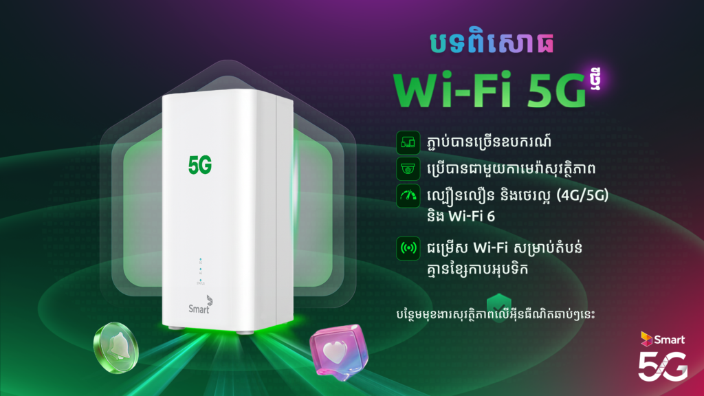 បន្ថែមលើសេវាទូរសព្ទចល័ត អតិថិជន Smart ក៏អាចទទួលបានបទពិសោធន៍ 5G នៅតាមផ្ទះផងដែរ តាមរយៈការសាកល្បងប្រើប្រាស់សេវា Smart@Home។ នេះគឺជាការនាំយកការតភ្ជាប់បណ្តាញជំនាន់ក្រោយដោយផ្ទាល់ទៅកាន់គេហដ្ឋាន ជាមួយនឹងការដំឡើងយ៉ាងងាយស្រួលបំផុតតាមរយៈ Router 5G Wi-Fi 6 នៅតាមតំបន់ដែលមានសេវា 5G គ្របដណ្តប់។