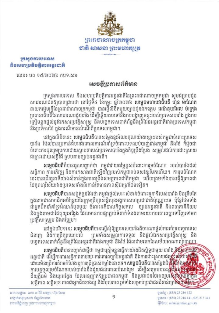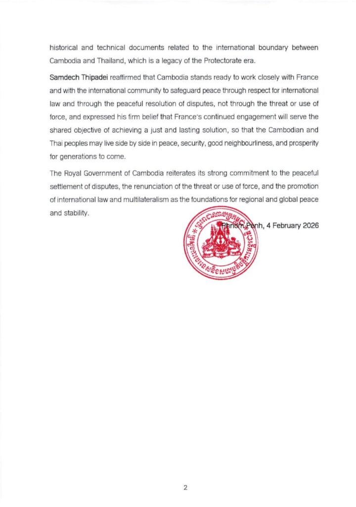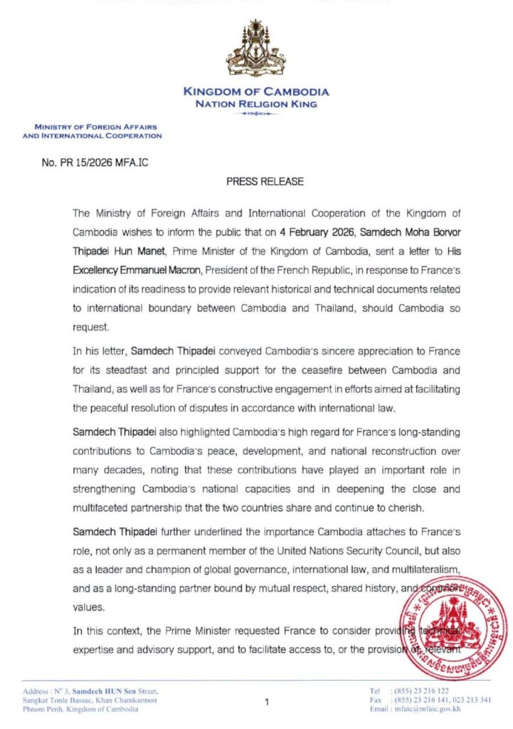ក្រសួងការបរទេស និងសហប្រតិបត្តិការអន្តរជាតិ បានប្រកាសថា នៅថ្ងៃទី៤ ខែកុម្ភៈ ឆ្នាំ២០២៦ សម្តេចមហាបវរធីបតី ហ៊ុន ម៉ាណែត នាយករដ្ឋមន្ត្រីនៃព្រះរាជាណាចក្រកម្ពុជា បានផ្ញើលិខិតមួយច្បាប់ជូនឯកឧត្តម អេម៉ានុយអែល ម៉ាក្រុង ប្រធានាធិបតីនៃសាធារណរដ្ឋបារាំង ដើម្បីឆ្លើយតបទៅនឹងការបង្ហាញឆន្ទៈរបស់ប្រទេសបារាំង ក្នុងការត្រៀមខ្លួនផ្តល់នូវឯកសារប្រវត្តិសាស្ត្រ និងបច្ចេកទេសពាក់ព័ន្ធនឹងព្រំដែនអន្តរជាតិរវាងប្រទេសកម្ពុជា និងប្រទេសថៃ ក្នុងករណីមានសំណើពីប្រទេសកម្ពុជា។