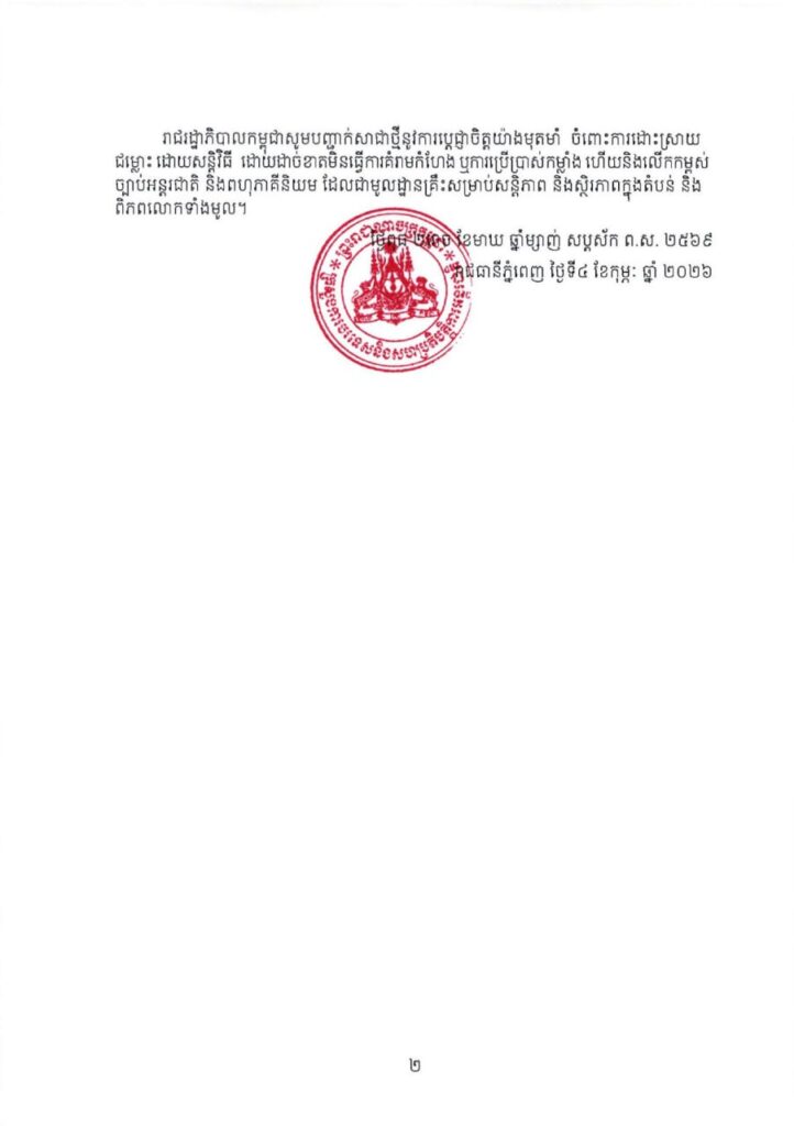 រាជរដ្ឋាភិបាលកម្ពុជាបញ្ជាក់សាជាថ្មីនូវការប្តេជ្ញាចិត្តយ៉ាងមុតមាំ ចំពោះការដោះស្រាយជម្លោះដោយសន្តិវិធី ដោយដាច់ខាតមិនធ្វើការគំរាមកំហែង ឬការប្រើប្រាស់កម្លាំង ហើយនិងលើកកម្ពស់ច្បាប់អន្តរជាតិ និងពហុភាគីនិយម ដែលជាមូលដ្ឋានគ្រឹះសម្រាប់សន្តិភាព និងស្ថិរភាពក្នុងតំបន់ និងពិភពលោកទាំងមូល៕