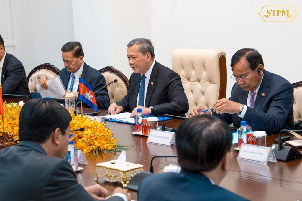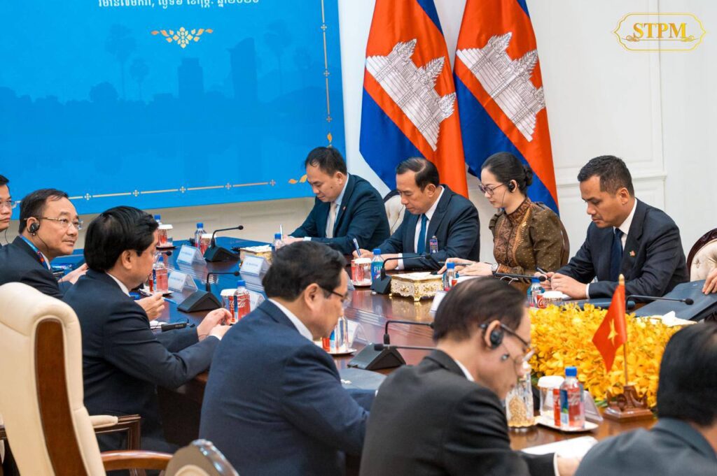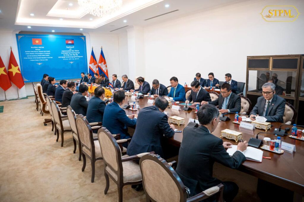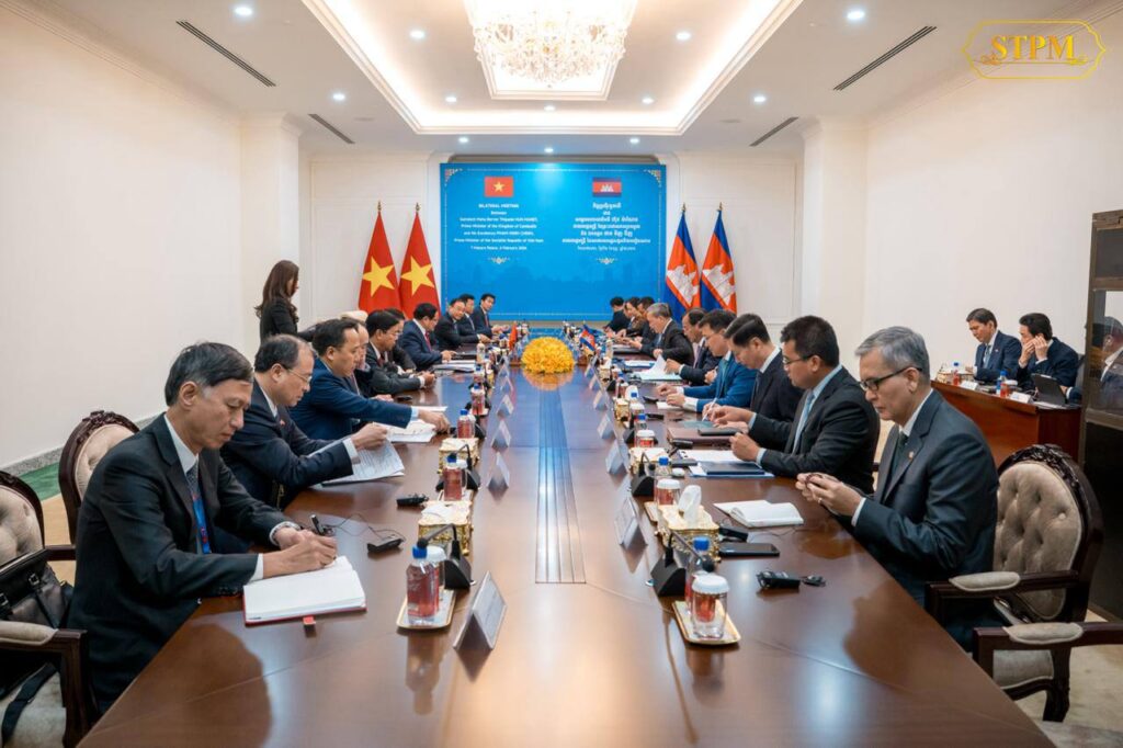 នារសៀលថ្ងៃទី០៦ ខែកុម្ភៈ ឆ្នាំ២០២៦, សម្តេចមហាបវរធិបតី ហ៊ុន ម៉ាណែត នាយករដ្ឋមន្រ្តី នៃព្រះរាជាណាចក្រកម្ពុជា បានទទួលជួបពិភាក្សាការងារជាមួយ ឯកឧត្តម ផាម មិញជិញ (PHAM Minh Chinh) នាយករដ្ឋមន្ត្រី នៃសាធារណរដ្ឋសង្គមនិយមវៀតណាម នៅវិមាន៧មករា ក្នុងឱកាសដែលឯកឧត្តមនាយករដ្ឋមន្ត្រីវៀតណាម បានដឹកនាំគណៈប្រតិភូ អញ្ជើញចូលរួមកិច្ចប្រជុំរវាងថ្នាក់ដឹកនាំគណបក្សប្រជាជនកម្ពុជា, ថ្នាក់ដឹកនាំគណបក្សកុម្មុយនីស្តវៀតណាម និងថ្នាក់ដឹកនាំគណបក្សប្រជាជនបដិវត្តន៍ឡាវ នៅរាជធានីភ្នំពេញ ព្រះរាជាណាចក្រកម្ពុជា ពីថ្ងៃទី៦ដល់ថ្ងៃទី៧ ខែកុម្ភៈ ឆ្នាំ២០២៦។