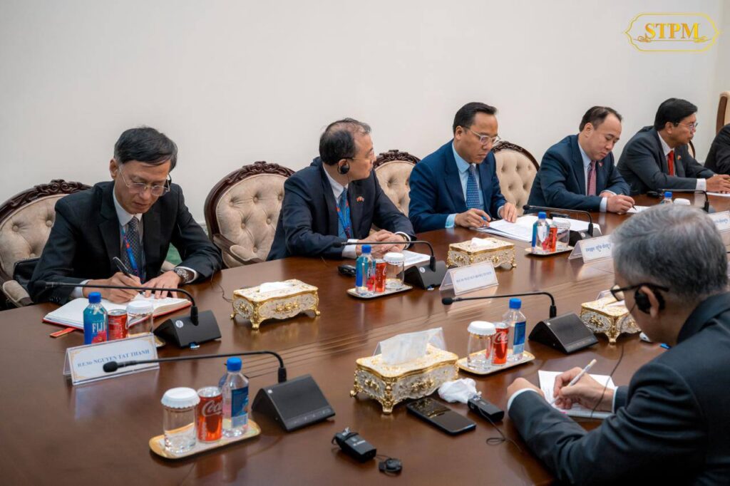 ក្នុងឱកាសនៃជំនួប, សម្ដេចបវរធិបតី បានសម្ដែងនូវសេចក្ដីសោមនស្សរីករាយ និងការស្វាគមន៍យ៉ាងកក់ក្ដៅជូនចំពោះ ឯកឧត្តម ផាម មិញជិញ និងគណៈប្រតិភូ ដែលបានអញ្ជើញចូលរួមកិច្ចប្រជុំកំពូលបីគណបក្ស លើកទី៤ ដែលកម្ពុជាធ្វើជាម្ចាស់ផ្ទះ បន្ទាប់ពីកិច្ចប្រជុំលើកទី៣ កាលពីខែកុម្ភៈ ឆ្នាំ២០២៥ ទីក្រុងហូជីមិញ នៃសាធារណរដ្ឋសង្គមនិយមវៀតណាម។