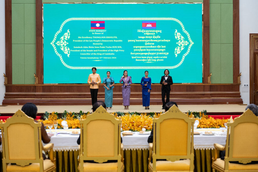 ភ្នំពេញ៖ ក្នុងព្រះបរមនាមព្រះករុណាព្រះបាទសម្តេចព្រះបរមនាថ នរោត្តម សីហមុនី ព្រះមហាក្សត្រនៃព្រះរាជាណាចក្រកម្ពុជា សម្តេចអគ្គមហាសេនាបតីតេជោ ហ៊ុន សែន ប្រធានព្រឹទ្ធសភានៃព្រះរាជាណាចក្រកម្ពុជា នៅថ្ងៃទី៧ ខែកុម្ភៈ ឆ្នាំ២០២៦ បានរៀបចំពិធីលៀងភោជនាហារផ្លូវរដ្ឋជូនឯកឧត្តមបណ្ឌិត ថងលុន ស៊ីសូលីត (Thongloun Sisoulith) ប្រធានរដ្ឋនៃសាធារណរដ្ឋប្រជាមានិតឡាវ និងគណៈប្រតិភូជាន់ខ្ពស់ នៅវិមានសាមគ្គីភាពនៃព្រឹទ្ធសភាជាតិ ក្នុងឱកាសឯកឧត្តមអញ្ជើញបំពេញទស្សនកិច្ចផ្លូវរដ្ឋនៅកម្ពុជា។