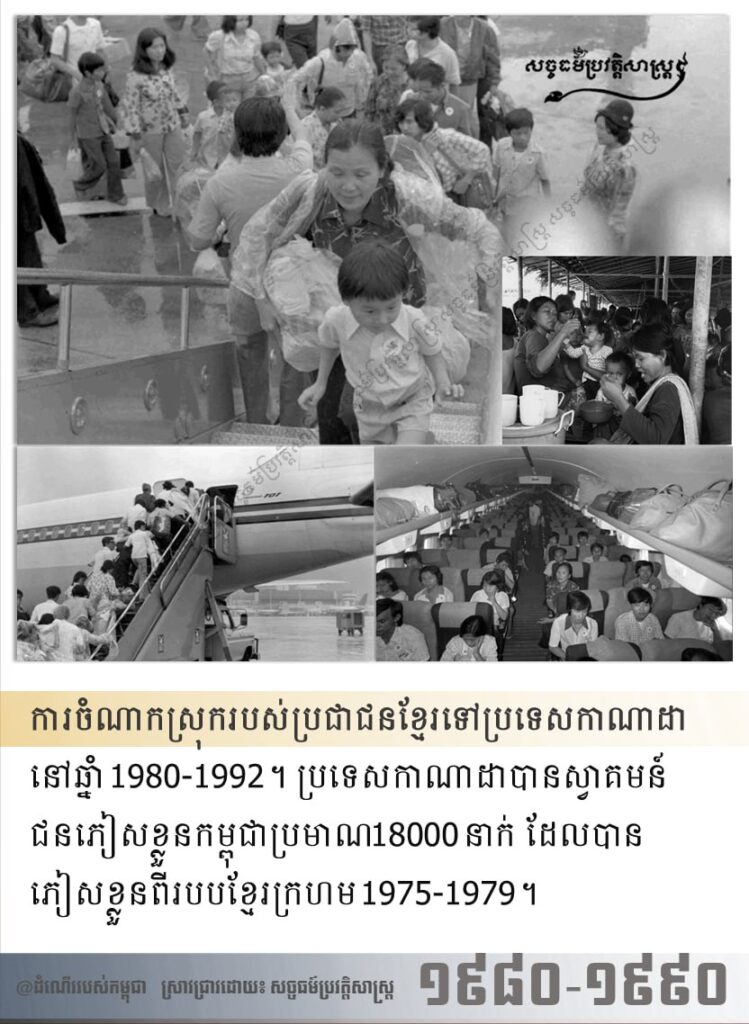 ការធ្វើការចំណាកស្រុករបស់ប្រជាជនខ្មែរទៅកាន់ប្រទេសកាណាដានៅឆ្នាំ 1980-1992។ ប្រទេសកាណាដាបានស្វាគមន៍ជនភៀសខ្លួនកម្ពុជាប្រមាណ18000នាក់ ដែលបានភៀសខ្លួនពីរបបខ្មែរក្រហម។ លទ្ធផលនៃការធ្វើជំរឿនបានបង្ហាញថាប្រជាជនប្រមាណ38490នាក់មានដើមកំណើតជាជនជាតិខ្មែរ។