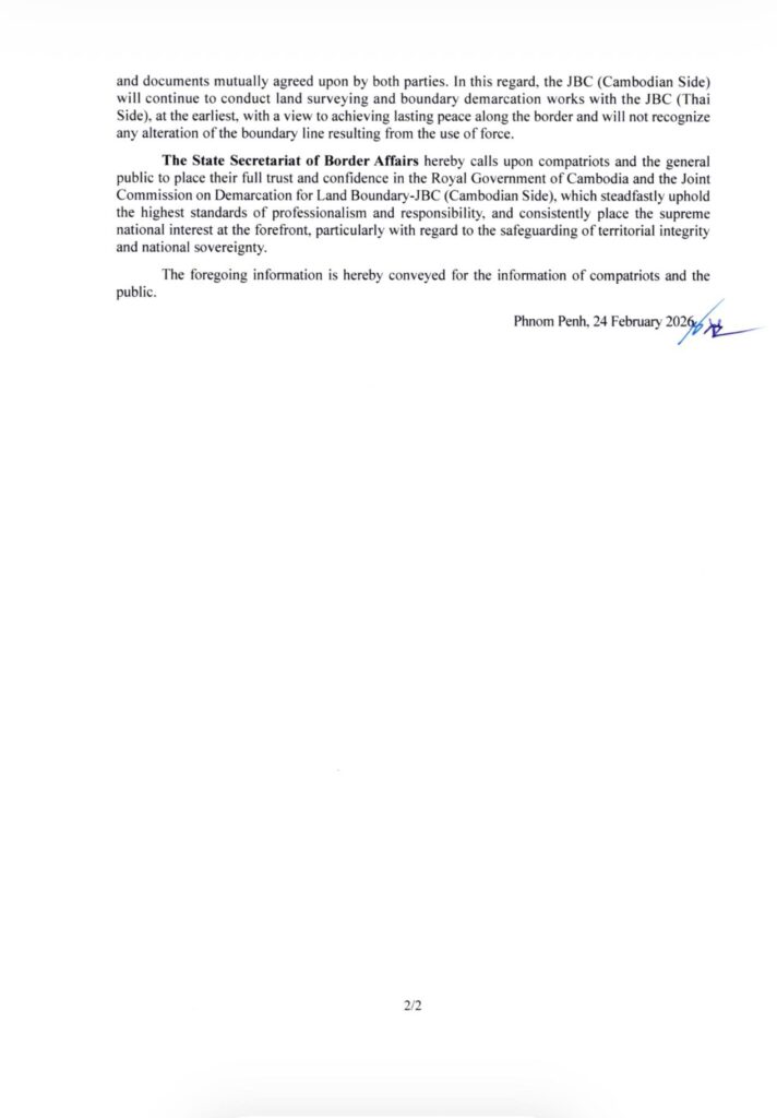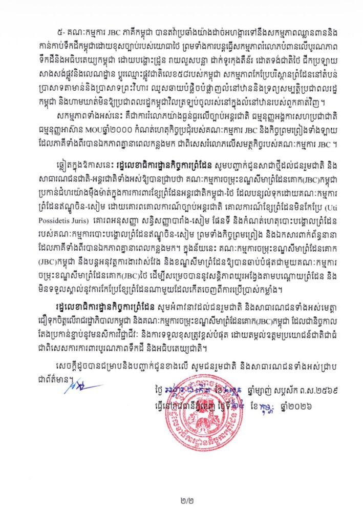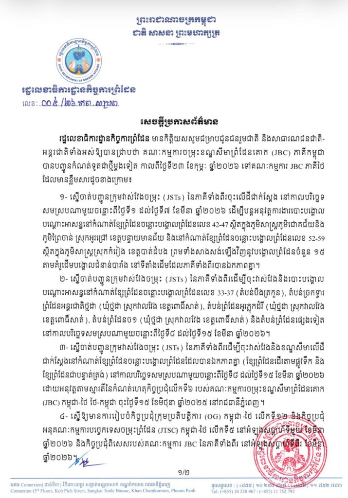៤- ស្នើឱ្យមានការរៀបចំកិច្ចប្រជុំក្រុមប្រតិបត្តិការ (OG) កម្ពុជា-ថៃ លើកទី១២ និងកិច្ចប្រជុំ អនុគណៈកម្មការបច្ចេកទេសចម្រុះព្រំដែន (JTSC) កម្ពុជា ថៃ លើកទី៥ នៅអំឡុងសប្តាហ៍ទីមួយ ខែមីនា ឆ្នាំ២០២៦ និងកិច្ចប្រជុំពិសេសរបស់គណៈកម្មការ JBC នៃភាគីទាំងពីរ នៅអំឡុងសប្តាហ៍ទីពីរ ខែមីនា ឆ្នាំ២០២៦។