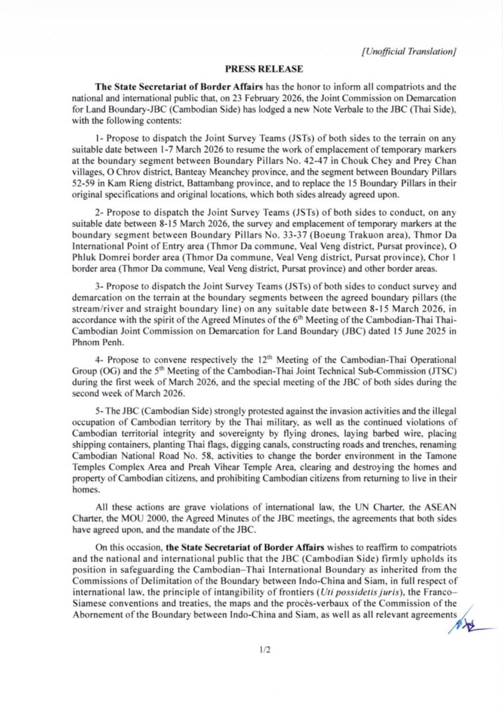 ៣- ស្នើចាត់បញ្ជូនក្រុមវាស់វែងចម្រុះ (JSTs) នៃភាគីទាំងពីរដើម្បីចុះវាស់វែង និងខណ្ឌសីមាលើដី ជាក់ស្តែងនៅកំណាត់ខ្សែព្រំដែនចន្លោះបង្គោលព្រំដែន ដែលបានឯកភាពគ្នា (ខ្សែព្រំដែនដើរតាមផ្លូវទឹក និង ខ្សែព្រំដែនជាបន្ទាត់ត្រង់) នៅកាលបរិច្ឆេទសមស្របណាមួយចន្លោះពីថ្ងៃទី៨ ដល់ថ្ងៃទី១៥ ខែមីនា ឆ្នាំ២០២៦ ដោយអនុវត្តតាមស្មារតីនៃកំណត់ហេតុកិច្ចប្រជុំលើកទី៦ របស់គណៈកម្មការចម្រុះខណ្ឌសីមាព្រំដែនគោក (JBC) កម្ពុជា-ថៃ ថៃ-កម្ពុជា ចុះថ្ងៃទី១៥ ខែមិថុនា ឆ្នាំ២០២៥ នៅរាជធានីភ្នំពេញ។