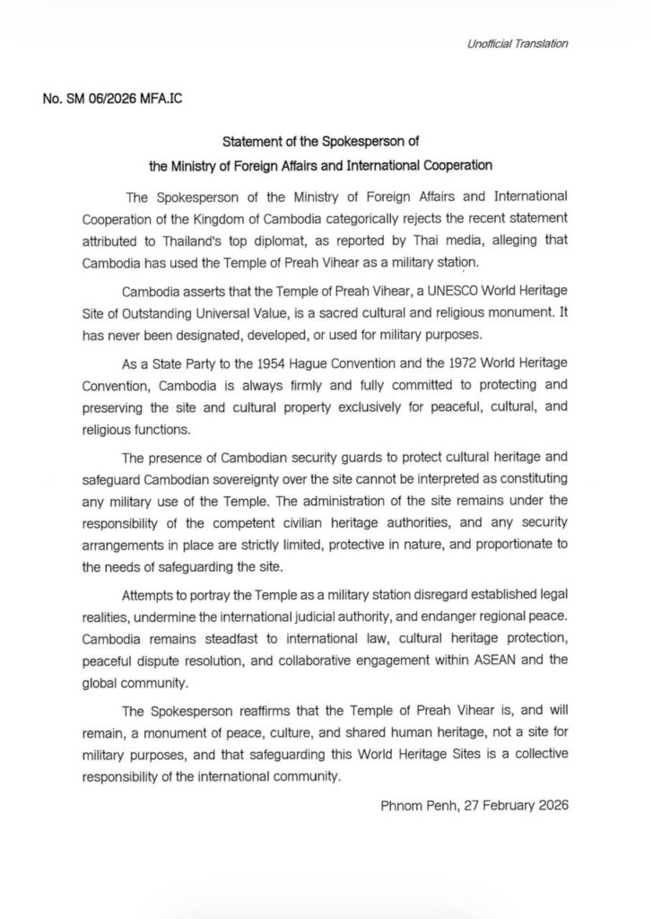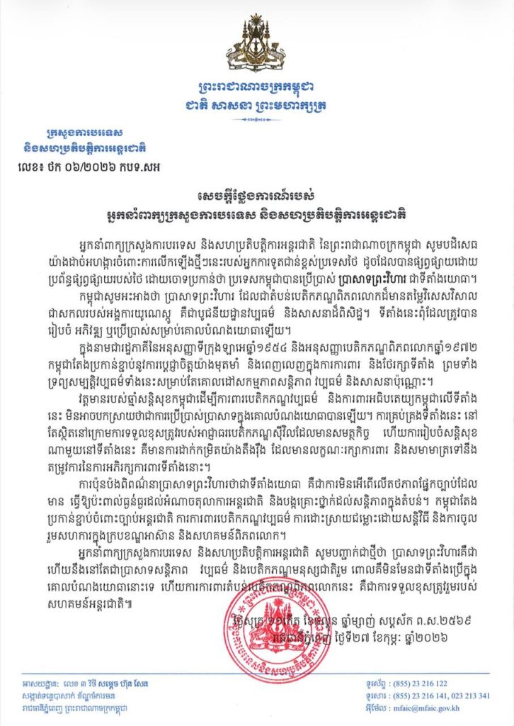 អ្នកនាំពាក្យក្រសួងការបរទេសនិងសហប្រតិបត្តិការអន្តរជាតិ នៃព្រះរាជាណាចក្រកម្ពុជា បដិសេធយ៉ាងដាច់អហង្ការចំពោះការលើកឡើងថ្មីៗនេះរបស់អ្នកការទូតជាន់ខ្ពស់ប្រទេសថៃ ដូចដែលបានផ្សព្វផ្សាយដោយប្រព័ន្ធផ្សព្វផ្សាយរបស់ថៃ ដោយចោទប្រកាន់ថា ប្រទេសកម្ពុជាបានប្រើប្រាស់ ប្រាសាទព្រះវិហារ ជាទីតាំងយោធា។ កម្ពុជាសូមអះអាងថា ប្រាសាទព្រះវិហារ ដែលជាតំបន់បេតិកភណ្ឌពិភពលោកដ៏មានតម្លៃវិសេសវិសាល ជាសកលរបស់អង្គការយូណេស្កូ គឺជាបូជនីយដ្ឋានវប្បធម៌ និងសាសនាដ៏ពិសិដ្ឋ។ ទីតាំងនេះពុំដែលត្រូវបាន រៀបចំ អភិវឌ្ឍ ឬប្រើប្រាស់សម្រាប់គោលបំណងយោធាឡើយ។