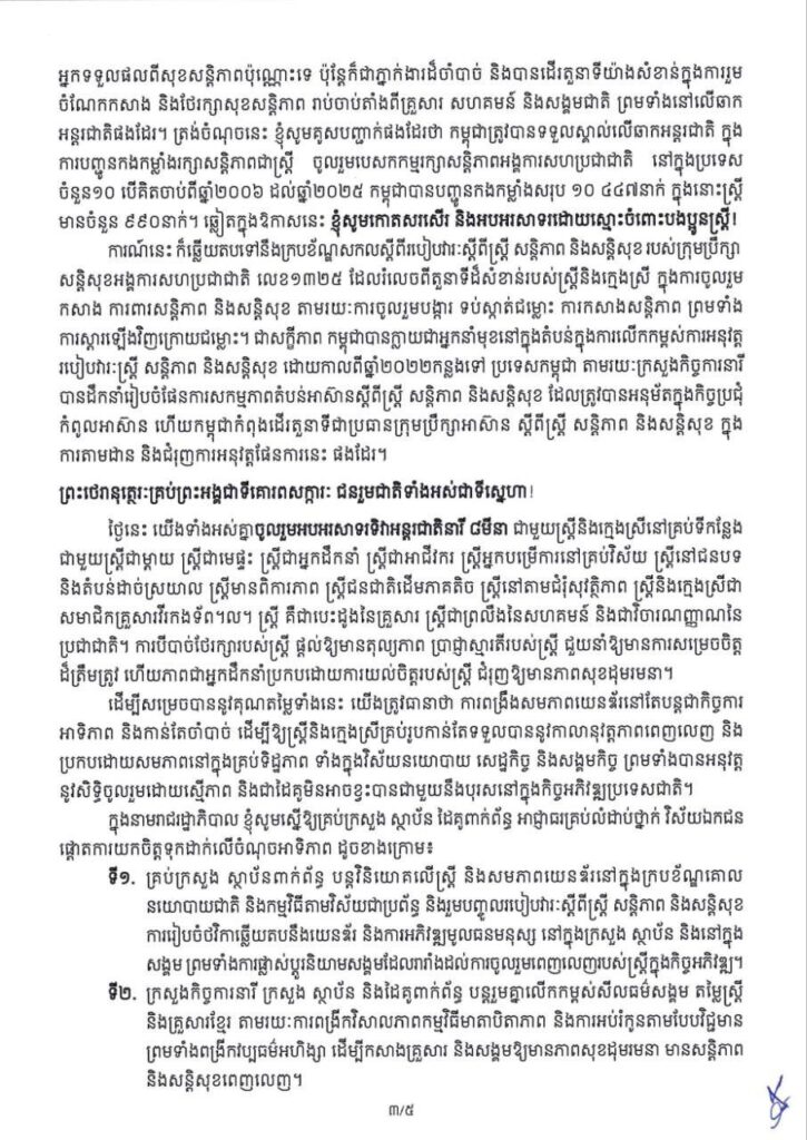 សម្តេចនាយករដ្ឋមន្ត្រី បន្តទៀតថា រាជរដ្ឋាភិបាលកម្ពុជា បានបន្តកំណត់ការលើកកម្ពស់សមភាពយេនឌ័រ និងការបង្កើនភាពអង់អាចរបស់ស្ត្រី និងក្មេងស្រីនៅគ្រប់វិស័យ ជាអាទិភាពនៅក្នុងរបៀបវារៈគោលនយោបាយ និងយុទ្ធសាស្ត្របញ្ចកោណ ដំណាក់កាលទី១តាមរយៈការពង្រឹងភាពជាពលរដ្ឋក្នុងសង្គមដែលមានអារ្យធម៌ខ្ពស់ប្រកបដោយសីលធម៌ សមធម៌ និងបរិយាបន្ន ដែលក្នុងនោះ«ស្ត្រីគឺជាស្នូល»។ រាជរដ្ឋាភិបាលបានបន្តបង្កើនការវិនិយោគលើសមភាពយេនឌ័រ និងបង្កើនភាព អង់អាចដល់ស្ត្រីនិងក្មេងស្រី នៅក្នុងវិស័យសេដ្ឋកិច្ច អប់រំ សុខភាព និងការដឹកនាំសាធារណៈ ដើម្បីទាញយក អត្ថប្រយោជន៍ពីភាគលាភយេនឌ័រ ការបង្កលក្ខណៈអំណោយផលដល់ស្ត្រីក្នុងការប្រើប្រាស់សិទ្ធិក្នុងការសម្រេចចិត្ត លើផែនការគ្រួសារ ការកាត់បន្ថយភាពងាយរងគ្រោះដោយអំពើហិង្សាទាក់ទងនឹងយេនឌ័រ និងការលើកកម្ពស់ ទំនាក់ទំនងអន្តរជំនាន់។ល។ ទន្ទឹមនោះ រាជរដ្ឋាភិបាលកម្ពុជាបានទទួលស្គាល់យ៉ាងមុតមាំថាស្ត្រីមិនត្រឹមតែជាអ្នកទទួលផលពីសុខសន្តិភាពប៉ុណ្ណោះទេ ប៉ុន្តែក៏ជាភ្នាក់ងារដ៏ចាំបាច់ និងបានដើរតួនាទីយ៉ាងសំខាន់ក្នុងការរួម ចំណែកកសាង និងថែរក្សាសុខសន្តិភាព រាប់ចាប់តាំងពីគ្រួសារ សហគមន៍ និងសង្គមជាតិ ព្រមទាំងនៅលើឆាក អន្តរជាតិផងដែរ។ ត្រង់ចំណុចនេះ ខ្ញុំសូមគូសបញ្ជាក់ផងដែរថា កម្ពុជាត្រូវបានទទួលស្គាល់លើឆាកអន្តរជាតិ ក្នុង ការបញ្ជូនកងកម្លាំងរក្សាសន្តិភាពជាស្ត្រី ចូលរួមបេសកកម្មរក្សាសន្តិភាពអង្គការសហប្រជាជាតិ នៅក្នុងប្រទេស ចំនួន១០ បើគិតចាប់ពីឆ្នាំ២០០៦ ដល់ឆ្នាំ២០២៥ កម្ពុជាបានបញ្ជូនកងកម្លាំងសរុប ១០ ៤៤៧នាក់ ក្នុងនោះស្ត្រី មានចំនួន ៩៩០នាក់។