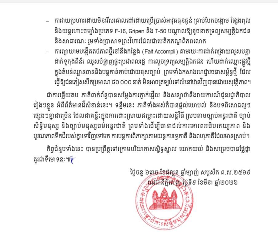 - ការវាយប្រហារដោយមិនរើសគោលដៅដោយប្រើប្រាស់អាវុធធុនធ្ងន់ គ្រាប់បែកចង្កោម ផ្សែងពុល និងយន្តហោះចម្បាំងប្រភេទ F-16, Gripen និង T-50 បណ្តាលឱ្យខូចខាតទ្រព្យសម្បត្តិឯកជន និងសាធារណៈ រួមទាំងប្រាសាទព្រះវិហារដែលជាបេតិកភណ្ឌពិភពលោក