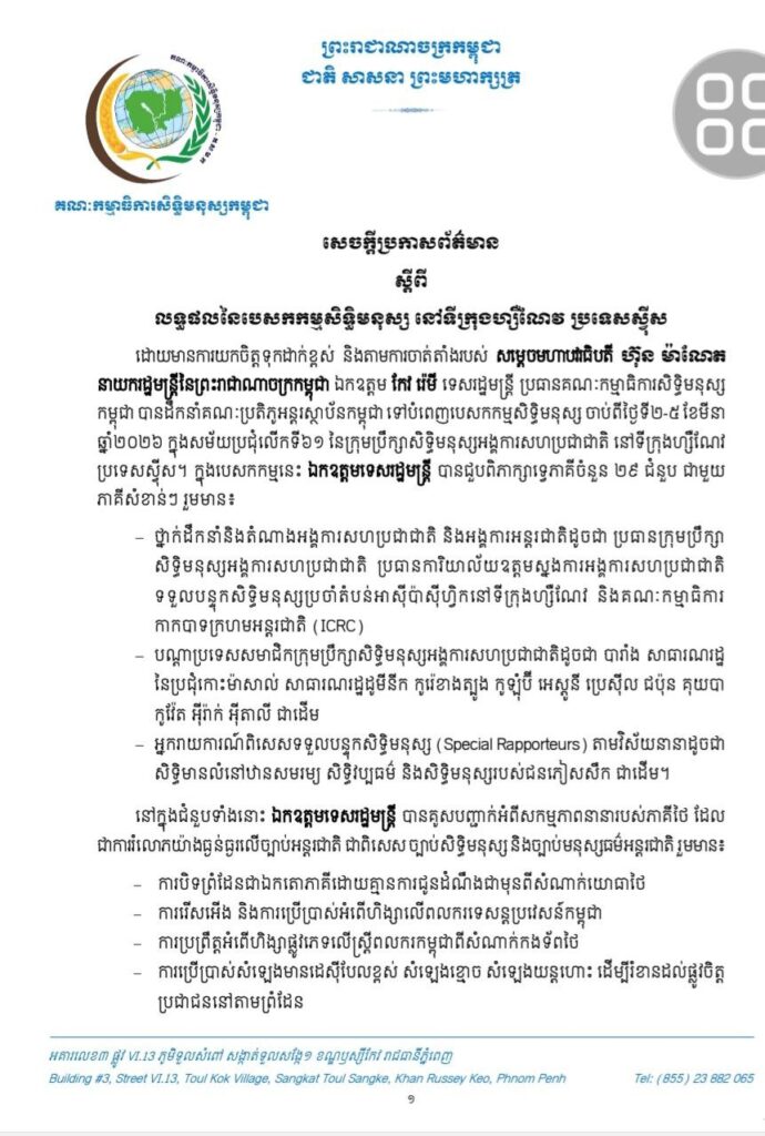 ដោយមានការយកចិត្តទុកដាក់ខ្ពស់ និងតាមការចាត់តាំងរបស់សម្តេចមហាបវរធិបតី ហ៊ុន ម៉ាណែត នាយករដ្ឋមន្ត្រីនៃព្រះរាជាណាចក្រកម្ពុជា ឯកឧត្តម កែវ រ៉េមី ទេសរដ្ឋមន្ត្រី ប្រធានគណៈកម្មាធិការសិទ្ធិមនុស្សកម្ពុជា បានដឹកនាំគណៈប្រតិភូអន្តរស្ថាប័នកម្ពុជា ទៅបំពេញបេសកកម្មសិទ្ធិមនុស្ស ចាប់ពីថ្ងៃទី២ ដល់ថ្ងៃទី៥ ខែមីនា ឆ្នាំ២០២៦ ក្នុងសម័យប្រជុំលើកទី៦១ នៃក្រុមប្រឹក្សាសិទ្ធិមនុស្សអង្គការសហប្រជាជាតិ នៅទីក្រុងហ្សឺណែវ ប្រទេសស្វ៊ីស។