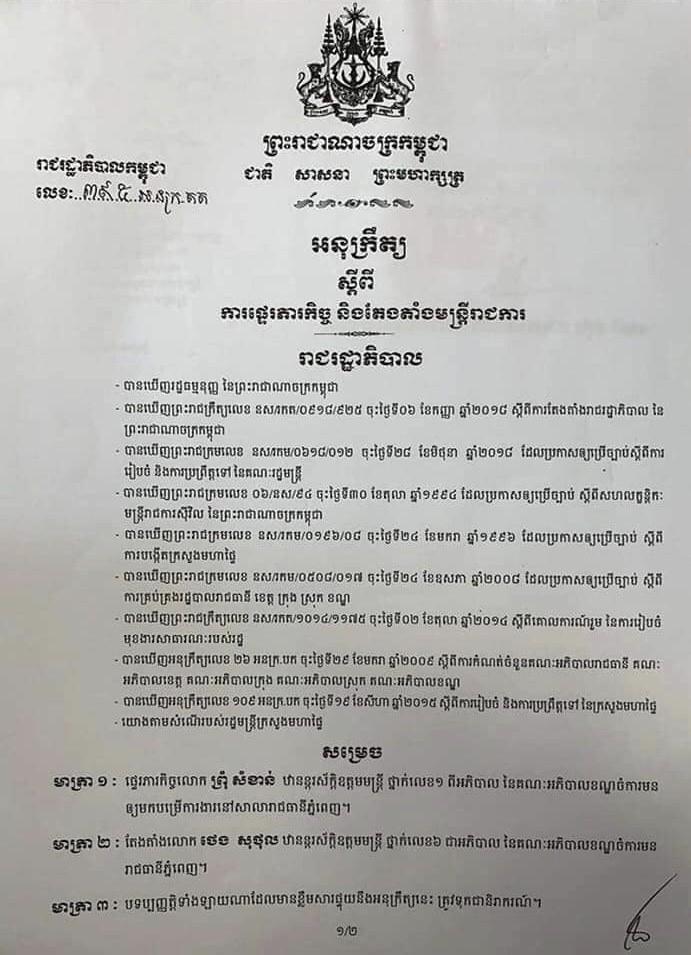 អនុក្រឹត្យស្តីពីការផ្ទេរភារកិច្ច និងតែងតាំងមន្ត្រីរាជការ អភិបាលខណ្ឌចំការមនព័ត៌មានអត្ថបទដោយ៖Kien Sereyvuth Kien SereyvuthIT Technical Supportអត្ថបទមុនអត្ថបទបន្ទាប់