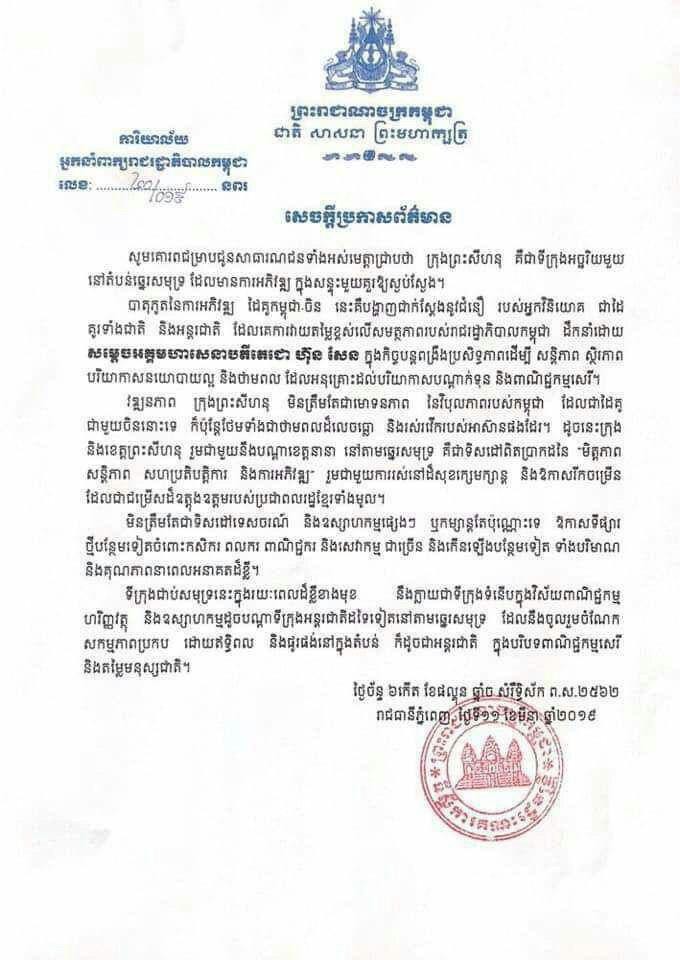 ការិយាល័យអ្នកនាំពាក្យរាជរដ្ឋាភិបាល៖ ក្រុងព្រះសីហនុ គឺជាទីក្រុងអច្ឆរិយមានការអភិវឌ្ឍក្នុងសន្ទុះមួយគួរឲ្យស្ញប់ស្ញែង