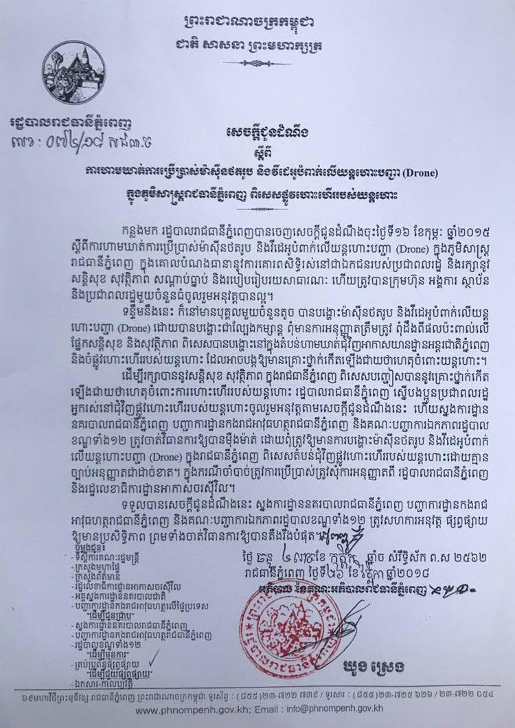 កន្លងមក រដ្ឋបាលរាជធានីភ្នំពេញ ធ្លាប់ចេញសេចក្តីជូនដំណឹង ដោយហាមឃាត់ការបង្ហោះ Drone នៅតំបន់ហាមឃាត់មួយចំនួន ក្រោមហេតុផលប៉ះពាល់សន្តិសុខ និងសិទ្ធិឯកជនរបស់ប្រជាពលរដ្ឋ ។ គួរបញ្ជាក់ផងដែរថា នាពេលកន្លងមកគេឃេីញថា អ្នកដែលបំពាន លួចបង្ហោះ Drone ក្នុងរាជធានីភ្នំពេញ គឺត្រូវបានឃាត់ខ្លួនជាបន្តបន្ទាប់រួមមកផងដែរ៕ធ.ដ