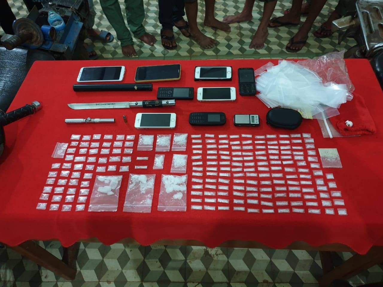 រក្សាទុកដឹកជញ្ជូនជួញដូរនិងប្រើប្រាស់ដោយខុសច្បាប់នូវសារជាតិញៀនចំនួនពីរករណីដោយឃាត់ខ្លួនជនសង្ស័យចំនួន13នាក់ស្រីពីរនាក់កាលពីល្ងាចថ្ងៃទី09ខែមិនាឆ្នាំ2019នៅស្រុកកោះសូទិន និង បើកបន្តដែនសមត្តកិច្ច ដល់ស្រុកបាធាយក្នុងកិច្ចប្រតិបត្តិការសមត្តកិច្ចរឹបអូសបានថ្នាំញៀនប្រភេទក្រាមពណ៏សហៅថាម៉ាទឹកកកចំនួន209កញ្ចប់ក្នុងនោះថ្នាំកញ្ចប់ធំចំនួន9កញ្ចប់និងកញ្ចប់តូចវំនួន200កញ្ចប់ជញ្ជីងអេឡិចត្រូនិចសំរាប់ថ្លឹងថ្នាំញៀន01គ្រឿងអាវុធខ្លី(ប៊ិចកាំភ្លើង)មួយដើមដាវសាំម៉ូរ៉ៃ01ដើមទូរសព្ទដៃចំនួន09គ្រឿងនិងម៉ូតូ06គ្រឿង។បច្ចុប្បន្នជនសង្ស័យនិងវត្ថុតាងកំលាំជំនាញស្នងការនគរបាលខេត្តកំពុងសួរនាំចងកហរងសំនុំរឿងបញ្ជូនទៅតុលាការចាត់ការតាមនិតិវិធី៕