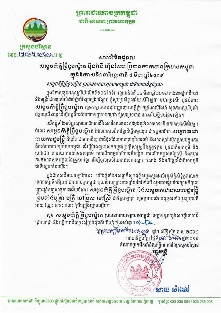 សារលិខិតជូនពរសម្តេចកិត្តិព្រឹទ្ធបណ្ឌិត ប៊ុនរ៉ានី ហ៊ុនសែន ប្រធានកាកបាទក្រហមកម្ពុជា ក្នុងឱកាសទិវានារីអន្តរជាតិ ៨មីនា ឆ្នាំ២០១៩ព័ត៌មានអត្ថបទដោយ៖Kien Sereyvuth Kien SereyvuthIT Technical Supportអត្ថបទមុនអត្ថបទបន្ទាប់