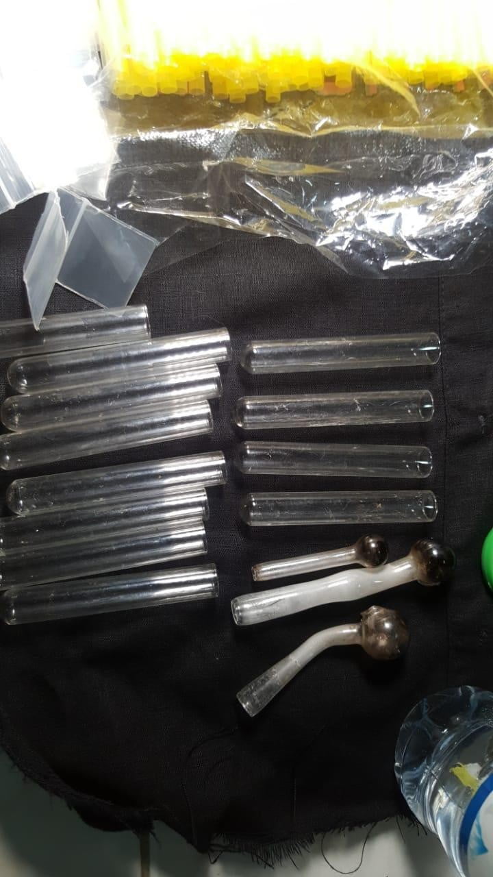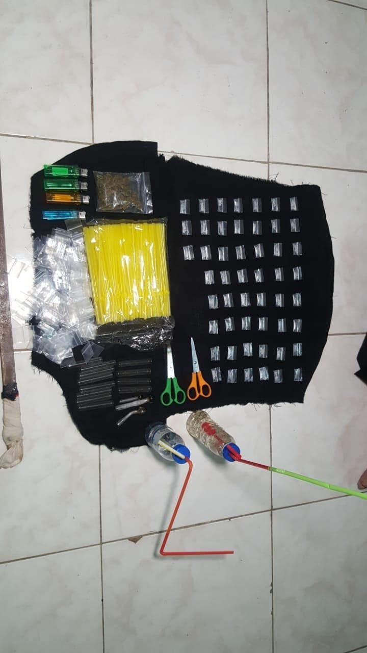 ២/-កញ្ឆាក្រៀមចំនួន 0១កញ្ចប់ (មិនទាន់ថ្លឹងទម្ងន់) ។៣/-ឧបករណ៍ប្រើប្រាស់សំរាប់សេពគ្រឿងញៀនមួយចំនួន ។៤/-ថង់សំរាប់ច្រកគ្រឿងញៀនធ្វើសកម្មភាព មួយចំនួន។៥/-ដាវសាំម៉ូកែច្នៃចំនួន 0១ដើម ។៦/-ទូរហ្គេមបាញ់ត្រីចំនួន 0៨គ្រឿង ។