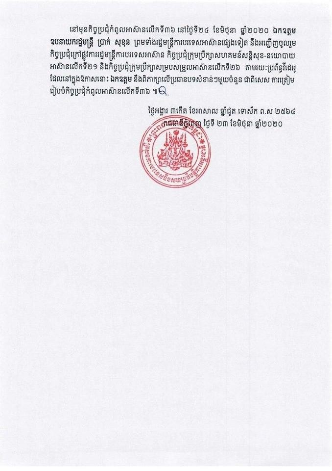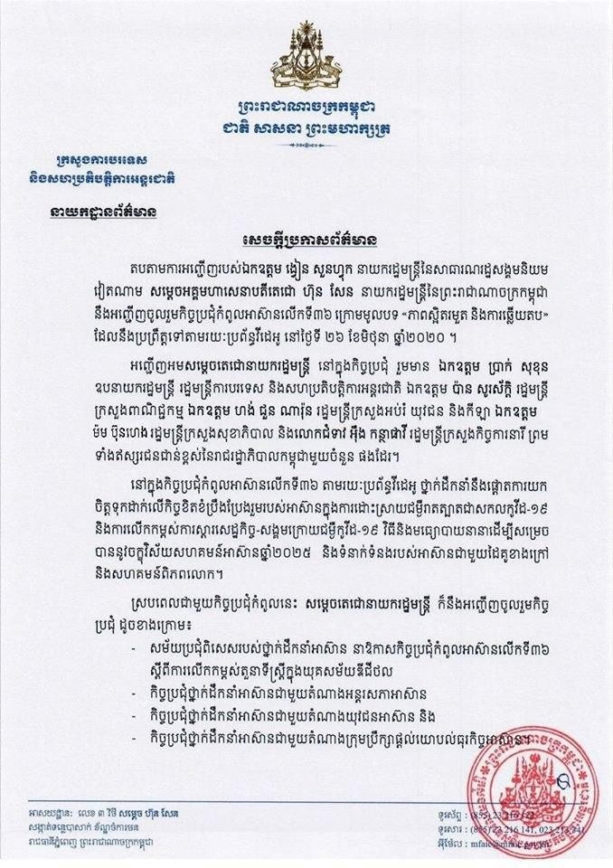 ភ្នំពេញ៖ យោងតាមសេចក្តីប្រកាសព័ត៌មានរបស់ក្រសួងការបរទេស និងសហប្រតិបត្តិការអន្តរជាតិ បានឲ្យដឹងថា នៅថ្ងៃទី២៦ ខែមិថុនា ឆ្នាំ២០២០ស្អែកនេះ សម្តេចអគ្គមហាសេនាបតីតេជោ ហ៊ុន សែន នាយករដ្ឋមន្រ្តី នៃព្រះរាជាណាចក្រកម្ពុជា នឹងអញ្ជើញចូលរួមកិច្ចប្រជុំកំពូលអាស៊ាន លើកទី៣៦ ក្រោមមូលបទ «ភាពស្អិតរមួត និងការឆ្លើយតប» ដែលនឹងប្រព្រឹត្តទៅតាមរយៈប្រព័ន្ធវីដេអូពីចម្ងាយ ។
