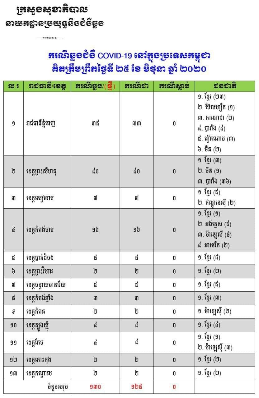 ក្រសួងសុខាភិបាល៖ រហូតដល់ម៉ោង ០៨:៣០ ព្រឹក ថ្ងៃទី២៥ មិថុនា ២០២០ យេីងពុំរកឃេីញករណីជំងឺកូវីដ-១៩ ថ្មីទេ ដូច្នេះចំនួនសរុបនៃអ្នកជំងឺកូវីដ-១៩ មាន ១៣០នាក់ ដដែល ចំនួនសំរាកនៅពេទ្យនៅសល់២នាក់ ចំនួនជាសះស្បេីយសរុប ចំនួន១២៨នាក់ និងស្លាប់គ្មាន។