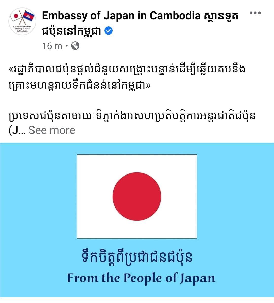 តាមស្ថានទូតជប៉ុននៅកម្ពុជានារសៀលថ្ងៃ២២តុលានេះ បានឲ្យដឹងថា