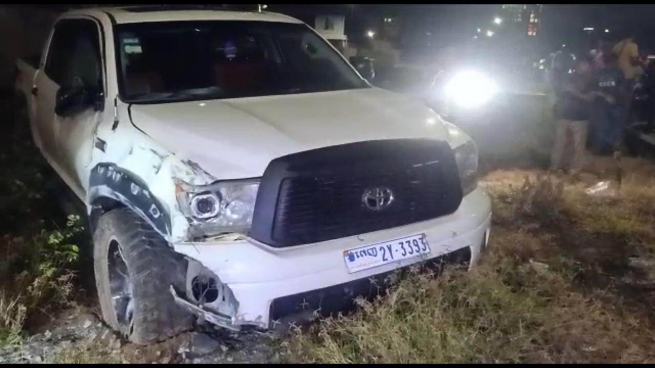 រថយន្ត TUNDRA បើកបរលឿនពេកដល់ផ្លូវកោងមិនបង្អង់ល្បឿនបានជ្រុលទៅបុកខឿនចែកទ្រូងផ្លូវបាក់ជាច្រើនកង់ ឯរថយន្តធ្លាក់ផ្លូវបន្តទៅបុករបងថ្មបន្ថែមរងការខូចខាត