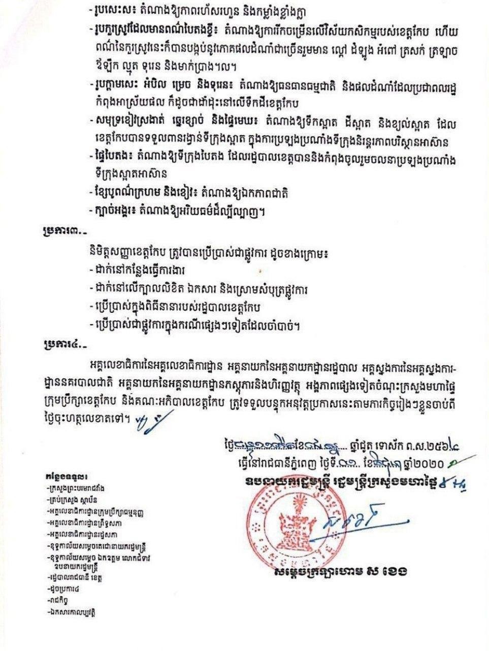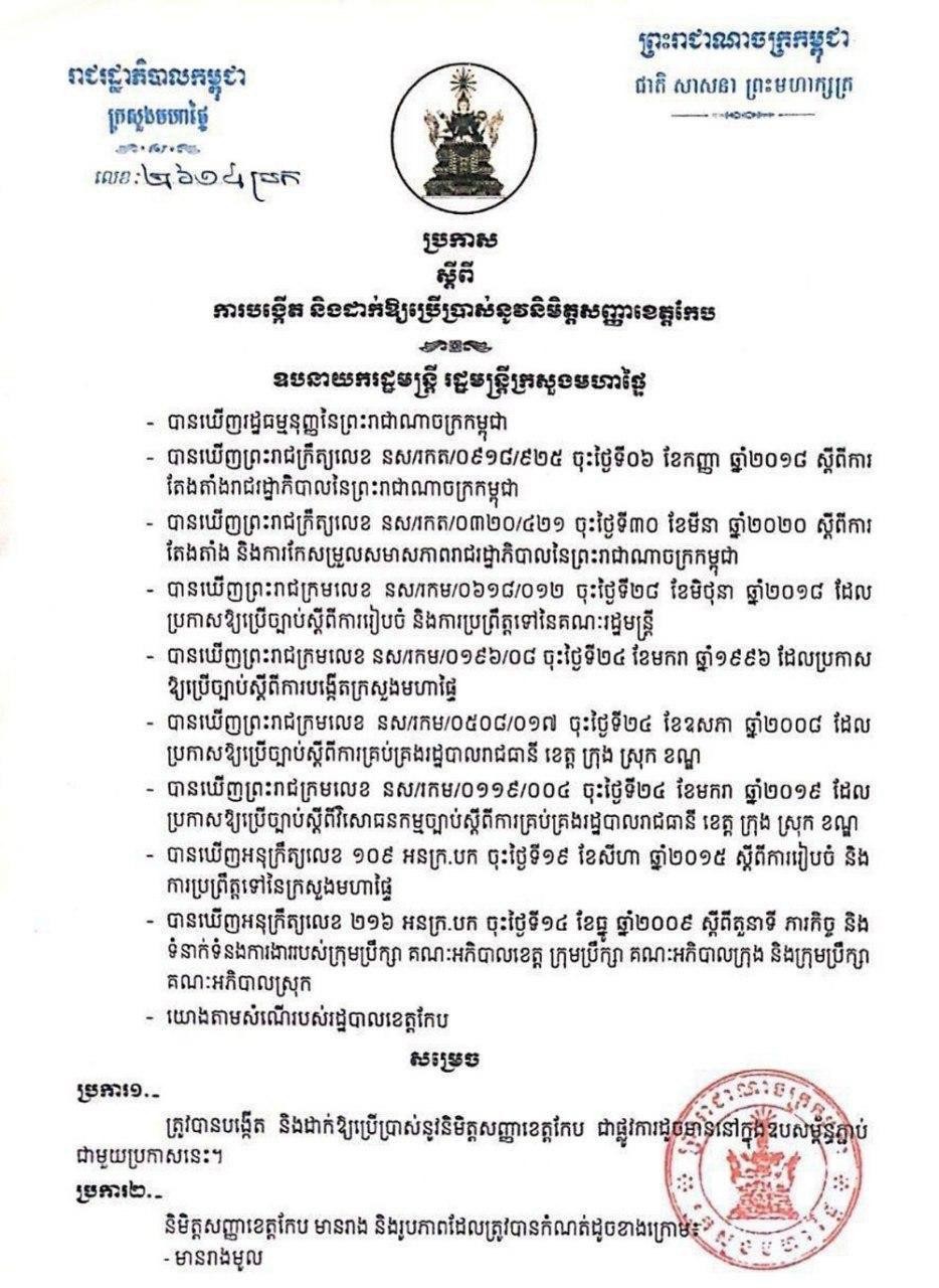 សម្តេចក្រឡាហោម ស ខេង ឧបនាយករដ្ឋមន្រ្តី រដ្ឋមន្រ្តីក្រសួងមហាផ្ទៃ បានសម្រេចបង្កើត និងដាក់ឲ្យប្រើប្រាស់ជាផ្លូវការនូវនិមិត្តសញ្ញា «ខេត្តកែប»
