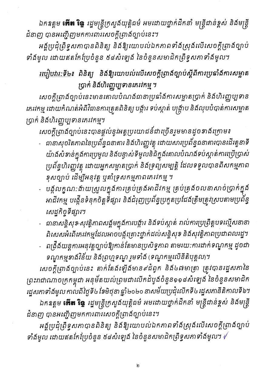 អង្គប្រជុំព្រឹទ្ធសភាបានពិនិត្យ និងឱ្យយោបល់ឯកភាពទាំងស្រុងលើសេចក្តីព្រាងច្បាប់ទាំងមូល ដោយឥតកែប្រែចំនួន ៥៨សំឡេង នៃចំនួនសមាជិកព្រឹទ្ធសភាទាំងមូល៕