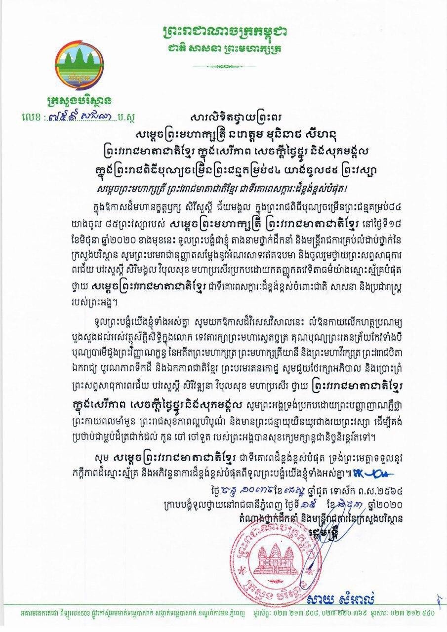 ក្រសួងបរិស្ថាន៖ សារលិខិតថ្វាយព្រះពរ សម្ដេចព្រះមហាក្សត្រី នរោត្ដម មុនិនាថ សីហនុ ព្រះវររាជមាតាជាតិខ្មែរ ក្នុងសេរីភាព សេចក្ដីថ្លៃថ្នូរ និងសុភមង្គល ក្នុងព្រះរាជពិធីបុណ្យចម្រើនព្រះជន្មគម្រប់ ៨៤ យាងចូល ៨៥ ព្រះវស្សាព័ត៌មានអត្ថបទដោយ៖Kien Sereyvuth Kien SereyvuthIT Technical Supportអត្ថបទមុនអត្ថបទបន្ទាប់
