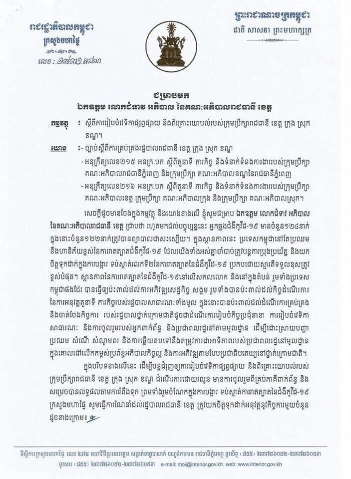 យោងតាមសេចក្តីណែនាំរបស់ក្រសួងមហាផ្ទៃ នៅថ្ងៃទី១៥ ខែមិថុនា ឆ្នាំ២០២០ បានឲ្យដឹងថា ដើម្បីបន្តជំរុញឲ្យការរៀបចំវេទិកាផ្សព្វផ្សាយ និងពិគ្រោះយោបល់របស់ក្រុមប្រឹក្សារាជធានី ខេត្ត ក្រុង ស្រុក ខណ្ឌ ដំណើរការដោយរលូន មានការចូលរួម ពីគ្រប់ភាគីពាក់ព័ន្ធ និងសម្រេចបានលទ្ធផល តាមការរំពឹងទុក ព្រមទាំងរួមចំណែក ក្នុងការបង្ការទប់ស្កាត់ ការរាត ត្បាតនៃជំងឺកូវីដ-១៩ ក្រសួងមហាផ្ទៃ ឲ្យចិត្តទុកដាក់អនុវត្តន៍កិច្ចការមួយចំនួន ៖