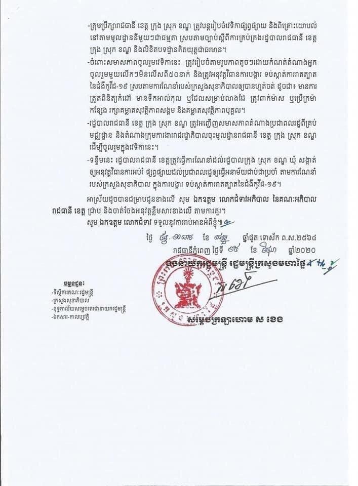 ទី៤-ទន្ទឹមនេះ រដ្ឋបាលរាជធានី ខេត្តត្រូវធ្វើការណែនាំដល់រដ្ឋបាលក្រុង ស្រុក ខណ្ឌ ឃុំ សង្កាត់ ឲ្យអនុវត្តន៍វិធានការអប់រំ ផ្សព្វផ្សាយដល់ប្រជាពលរដ្ឋ ដើម្បីធ្វើអនាម័យជាប់ជាប្រចាំ តាមការណែនាំ របស់ក្រសួងសុខាភិបាល ក្នុងការបង្ការ ទប់ស្កាត់កាតត្បាតនៃជំងឺកូវីដ-១៩៕
