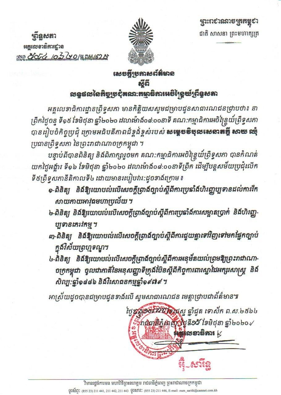 បន្ទាប់ពីបានពិនិត្យ និងពិភាក្សារួចមក គណៈកម្មាធិការអចិន្ត្រៃយ៍ព្រឹទ្ធសភា បានកំណត់យកថ្ងៃអង្គារ ទី១៦ ខែមិថុនា ឆ្នាំ២០២០ វេលាម៉ោង០៨:០០នាទីព្រឹក ដើម្បីបន្តសម័យប្រជុំលើកទី៥ព្រឹទ្ធសភានីតិកាលទី៤ ដោយមានរបៀបវារៈដូចខាងក្រោម ៖