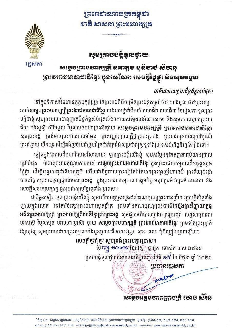 រដ្ឋសភា៖ សូមក្រាបបង្គំទូលថ្វាយ សម្តេចព្រះមហាក្សត្រី នរោត្តម មុនិនាថ សីហនុ ព្រះវររាជមាតាជាតិខ្មែរ ក្នុងសេរីភាព សេចក្តីថ្ងៃថ្នូរ និងសុភមង្គល ក្នុងឱកាសនៃព្រះរាជពិធីចម្រើនព្រះជន្មគម្រប់៨៤ យាងចូល ៨៥ព្រះវស្សាព័ត៌មានអត្ថបទដោយ៖Kien Sereyvuth Kien SereyvuthIT Technical Supportអត្ថបទមុនអត្ថបទបន្ទាប់