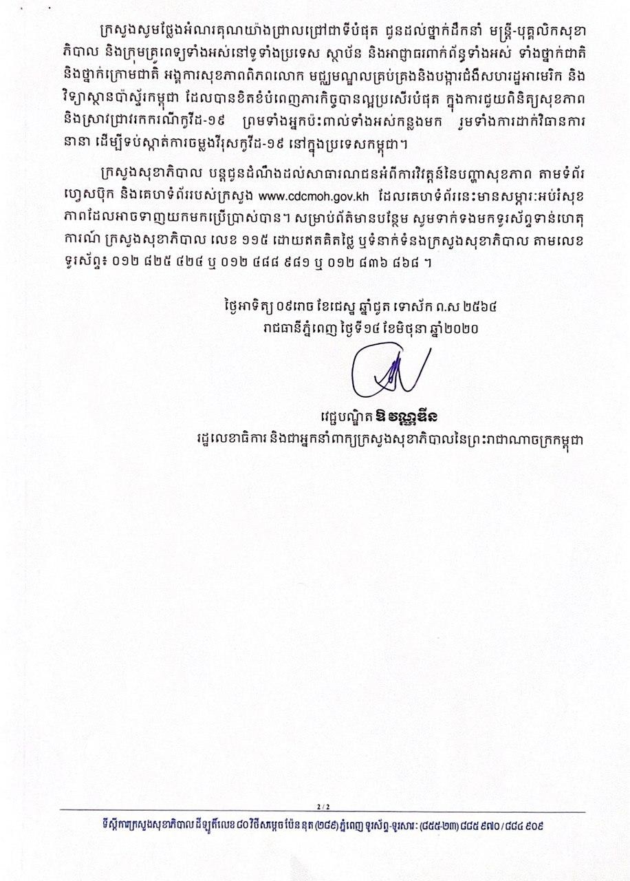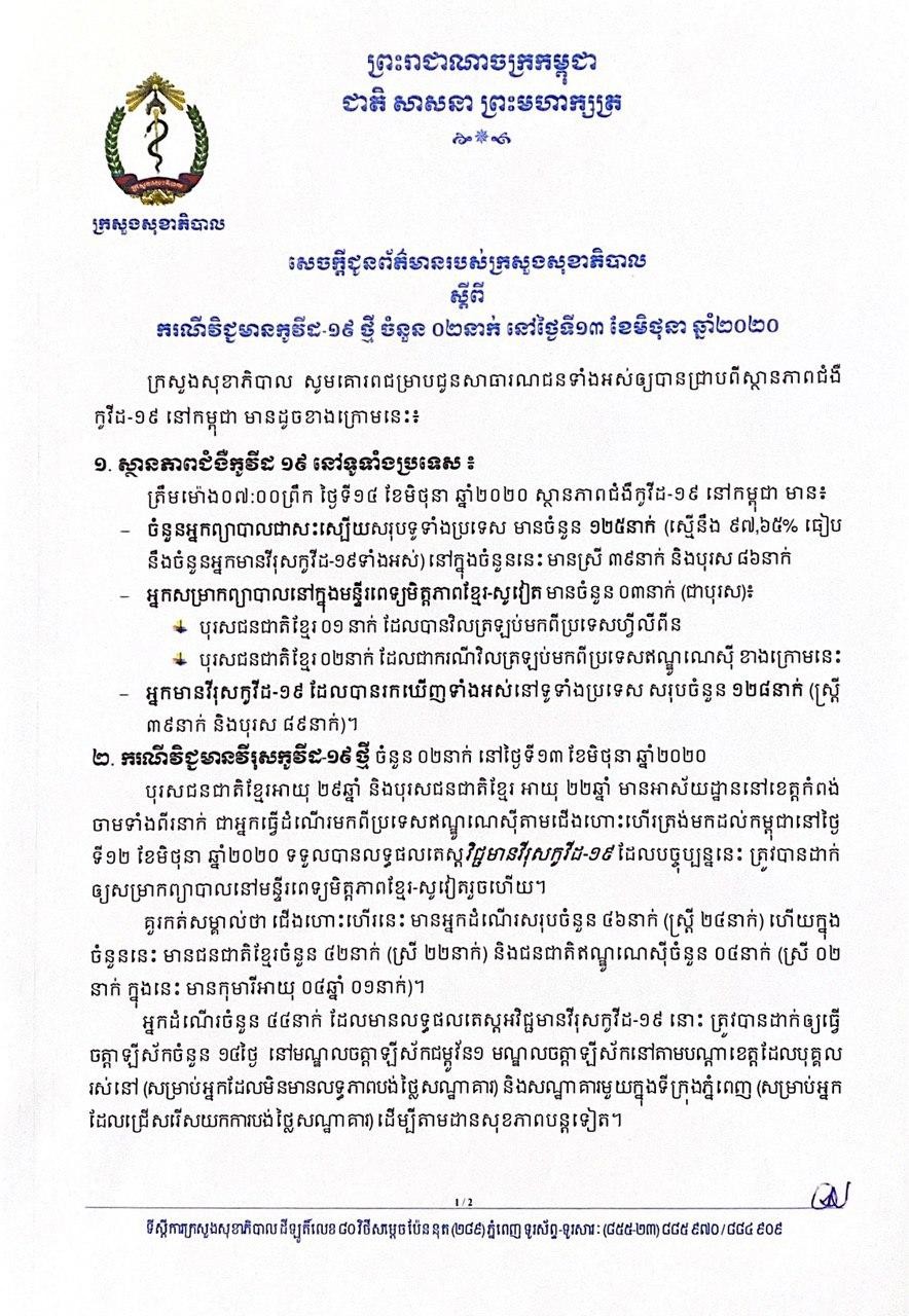 យោងតាមសេចក្តីប្រកាសរបស់ក្រសួងសុខាភិបាល ចេញផ្សាយនៅថ្ងៃទី១៤ ខែមិថុនា ឆ្នាំ២០២០នេះ ករណីកូវីដ១៩ ថ្មីចំនួន២ករនី បានរកឃើញលើខ្លួនជនជាតិខ្មែរ២រូប ដែលទើបត្រឡប់មកពីប្រទេសឥណ្ឌូនេស៊ី តាមជើងហោះហើរត្រង់មកដល់កម្ពុជា នៅថ្ងៃទី១២ ខែមិថុនា ឆ្នាំ២០២០។ បើតាមការឱ្យដឹងរបស់ក្រសួងសុខាភិបាល, យន្តហោះខាងលើនេះ មានអ្នកដំណើរសរុបចំនួន ៤៦នាក់ (ស្រី្ត ២៤នាក់) ហើយក្នុងចំនួននេះ មានជនជាតិខ្មែរចំនួន ៤២នាក់ (ស្រី ២២នាក់) និងជនជាតិឥណ្ឌូណេស៊ីចំនួន ០៤នាក់ (ស្រី ០២នាក់ ក្នុងនេះ មានកុមារីអាយុ ០៤ឆ្នាំ ០១នាក់)។ អ្នកដំណើរចំនួន ៤៤នាក់ មានលទ្ធផលតេស្តអវិជ្ជមានវីរុសកូវីដ-១៩ ហើយ ត្រូវបានដាក់ឱ្យធ្វើចត្តាឡីស័កចំនួន ១៤ថ្ងៃ នៅមណ្ឌលចត្តាឡីស័ក និងធ្វើចត្តាឡីស័កនៅតាមមណ្ឌលនៅតាមខេត្តនីមួយៗ ។