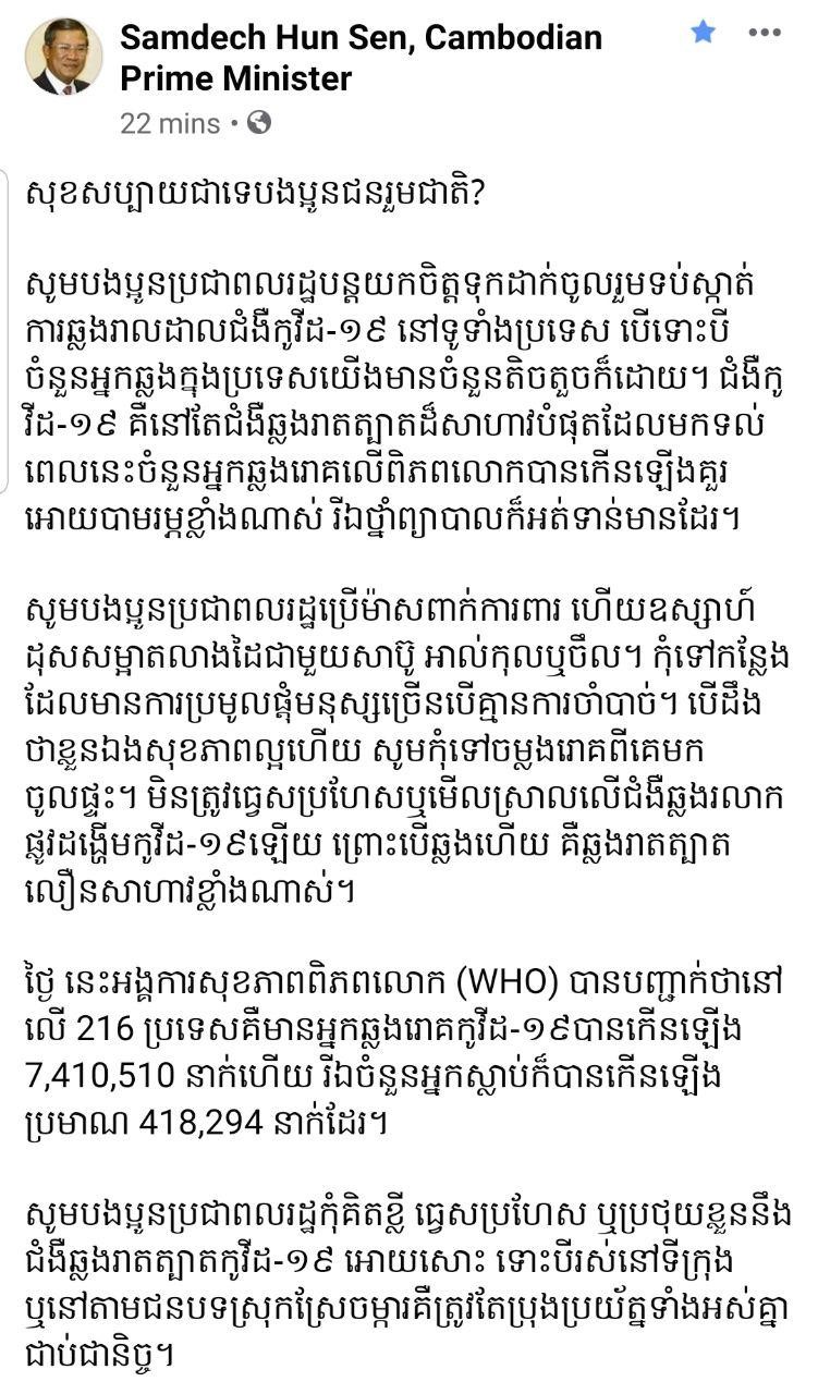 ថ្លែងនៅលើបណ្ដាញទំនាក់ទំនងសង្គមហ្វេសប៊ុកផ្លូវការ សម្តេចតេជោ ហ៊ុន សែន បានសរសេរដូច្នេះថា សុខសប្បាយជាទេបងប្អូនជនរួមជាតិ?
