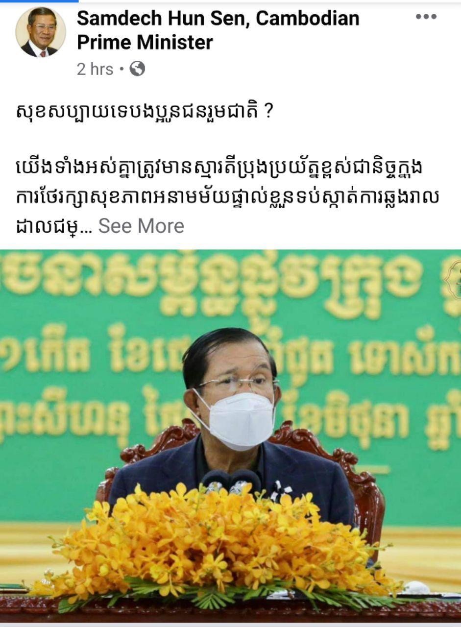សម្ដេចតេជោ ហ៊ុន សែន បានសរសេរលើទំព័រហ្វេសប៊ុកដូច្នេះថា សុខសប្បាយទេបងប្អូនជនរួមជាតិ ? យើងទាំងអស់គ្នាត្រូវមានស្មារតីប្រុងប្រយ័ត្នខ្ពស់ជានិច្ច ក្នុងការថែរក្សាសុខភាពអនាមម័យផ្ទាល់ខ្លួនទប់ស្កាត់ការឆ្លងរាលដាល ជម្ងឺរលាកផ្លូវដង្ហើមកូវីដ១៩។ ជំងឺរាតត្បាតនេះងាយឆ្លងសាហាវខ្លាំងណាស់ អញ្ចឹងហើយបានជាប្រទេសជាច្រើនកំពុងបិទប្រទេស ដាក់បម្រាមហាមឃាត់មិនអោយពលរដ្ឋធ្វើដំណើរ។
