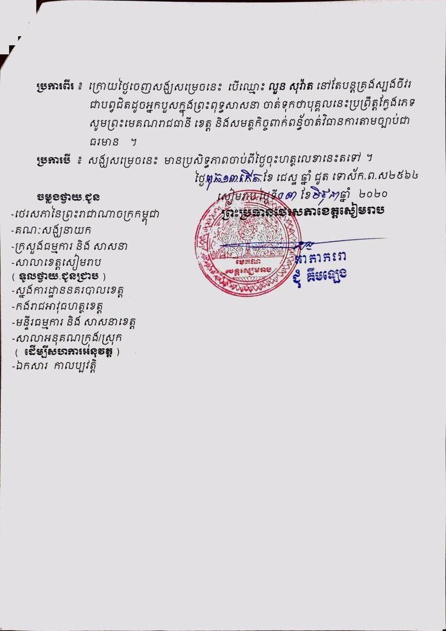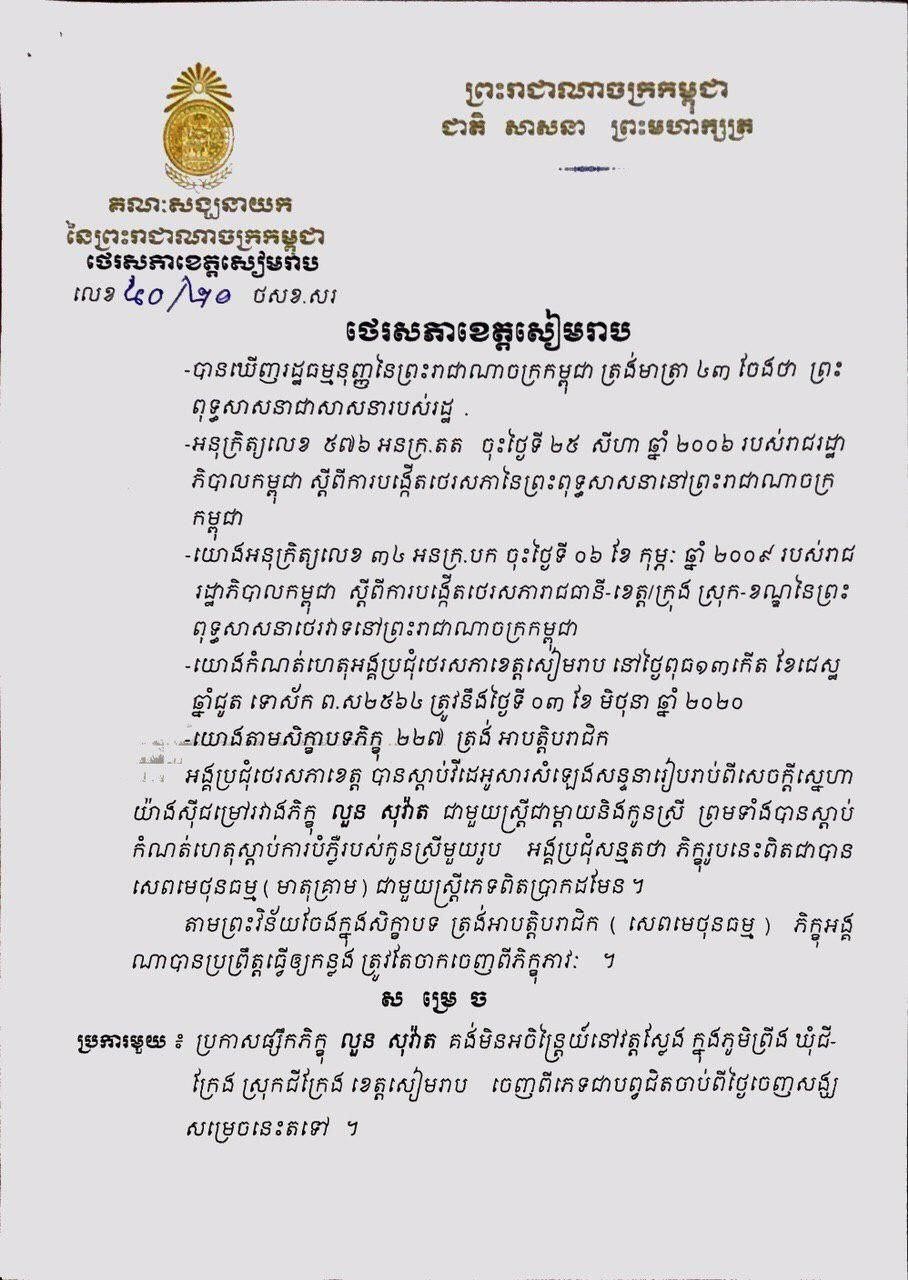 យោងតាមលិខិតរបស់គណៈសង្ឃនាយក នៃព្រះរាជាណាចក្រកម្ពុជា ថេរសភាខេត្ត សៀមរាប បានអោយដឹងថាតាមព្រះវិន័យចែងក្នុងសិក្ខាបទត្រង់អាបត្តិបរាជិក(សេពមេថុនធម្ម)ភិក្ខុអង្គណាបានប្រព្រឹត្តធ្វើឲ្យកន្លង ត្រូវតែចាកចេញពីភិក្ខុភាវៈជាអ្នកបួស។