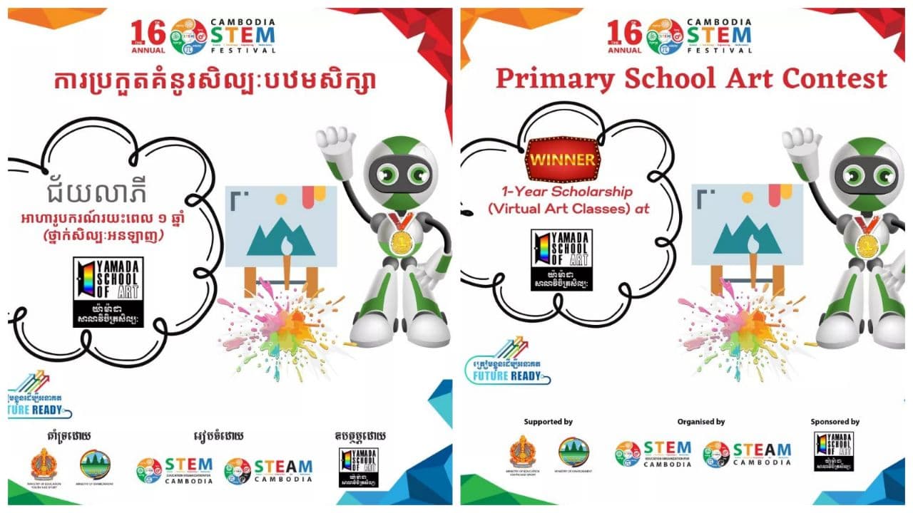 សូមជម្រាបថា ការប្រកួតគំនូរសិល្បៈស្ទែមសម្រាប់កម្រិតបឋមសិក្សា ក្រោមប្រធានបទ “ត្រៀមខ្លួនដើម្បីអនាគត”។ គំនូរសិល្បៈដែលបានដាក់ពាក្យចូលរួមទាំងអស់ នឹងត្រូវដាក់តាំងពិព័រណ៍អនឡាញក្នុងពិព័រណ៍ស្ទែមអនឡាញ រួមទាំងការប្រកាសលទ្ធផលផងដែរ។ សម្រាប់ជ័យលាភីការប្រកួតគំនូរសិល្បៈស្ទែមបឋមសិក្សា នឹងទទួលបានអាហារូបករណ៍ថ្នាក់សិល្បៈអនឡាញរយៈពេលមួយឆ្នាំ នៅសាលា Yamada School of Art ៕