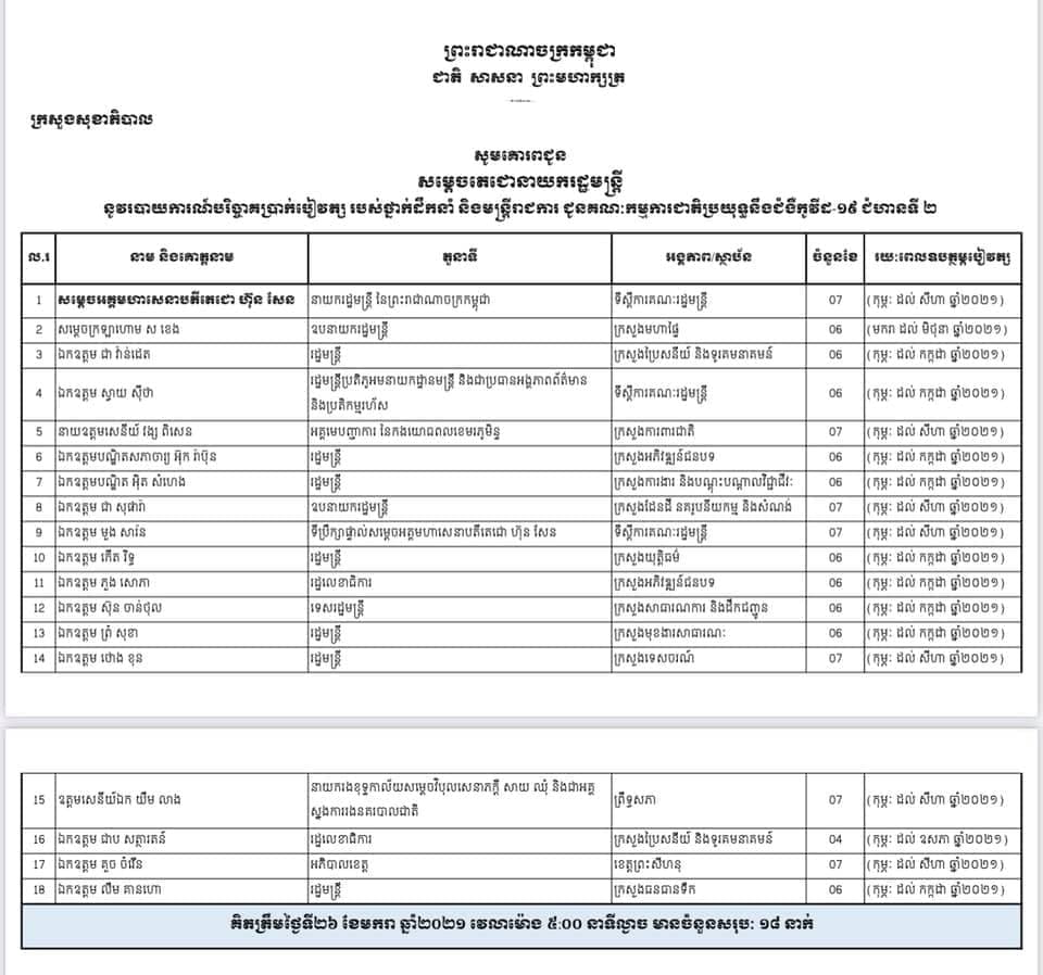 បញ្ជីឈ្មោះថ្នាក់ដឹកនាំ មន្ត្រីរាជការ និងសប្បុរសជនដែលបានចូលរួមចំណែកជាមួយរាជរដ្ឋាភិបាលតាមរយៈក្រសួងសុខាភិបាល បរិច្ចាគថវិកាបៀរវត្សរបស់ខ្លួនដោយស្ម័គ្រចិត្ត និងដោយសុទ្ធចិត្តក្នុងការបន្តប្រយុទ្ធប្រឆាំងនឹងជំងឺកូវីដ-១៩ នៅកម្ពុជា។
