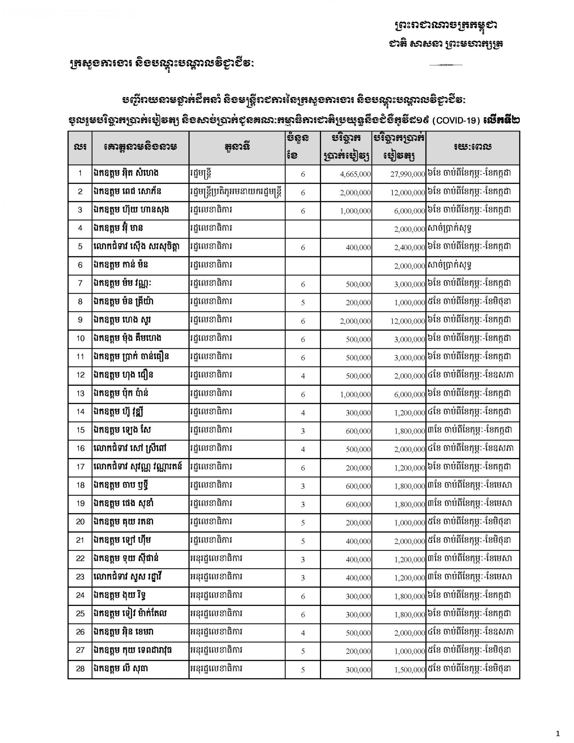 បញ្ជីរាយនាមថ្នាក់ដឹកនាំ និងមន្រ្តីរាជការនៃក្រសួងការងារ និងបណ្តុះបណ្តាលវិជ្ជាជីវៈចូលរួមបរិច្ចាកប្រាក់បៀវត្ស និងសាច់ប្រាក់ជូនគណៈកម្មាធិការជាតិប្រយុទ្ធនឹងជំងឺកូវីដ១៩ (COVID 19)