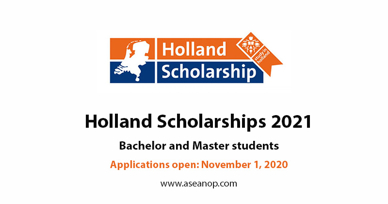សូមបញ្ជាក់ថា កម្មវិធីអាហារូបករណ៍នេះ មាន 41 សាកលវិទ្យាល័យសិ្ថតក្រោមក្រសួងអប់រំនិងវិទ្យាសាស្ត្រនៃប្រទេសហូឡង់ ផ្ដល់ដោយក្រសួងអប់រំហូឡង់ សម្រាប់និស្សិតបន្តការសិក្សាថ្នាក់បរិញ្ញាបត្រ និងថ្នាក់បរិញ្ញាបត្រជាន់ខ្ពស់។ បេក្ខជនដែលមានចំណាប់អារម្មណ៍អាចដាក់ពាក្យពីថ្ងៃនេះរហូតដល់ថ្ងៃទី01 ខែឧសភា ឆ្នាំ2021។ សម្រាប់ព័ត៌មានបន្ថែម និងការដាក់ពាក្យសូមចូលទៅកាន់៖ https://www.studyinholland.nl/finances/holland-scholarship ។